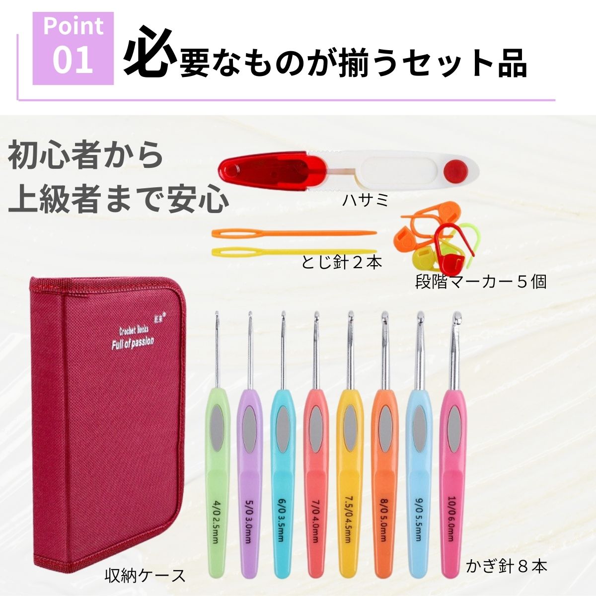 このかぎ針編みセットは、初心者から上級者まで幅広くおすすめできるアイテムです。