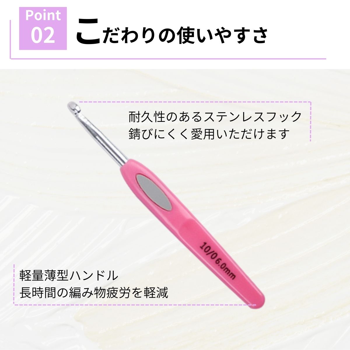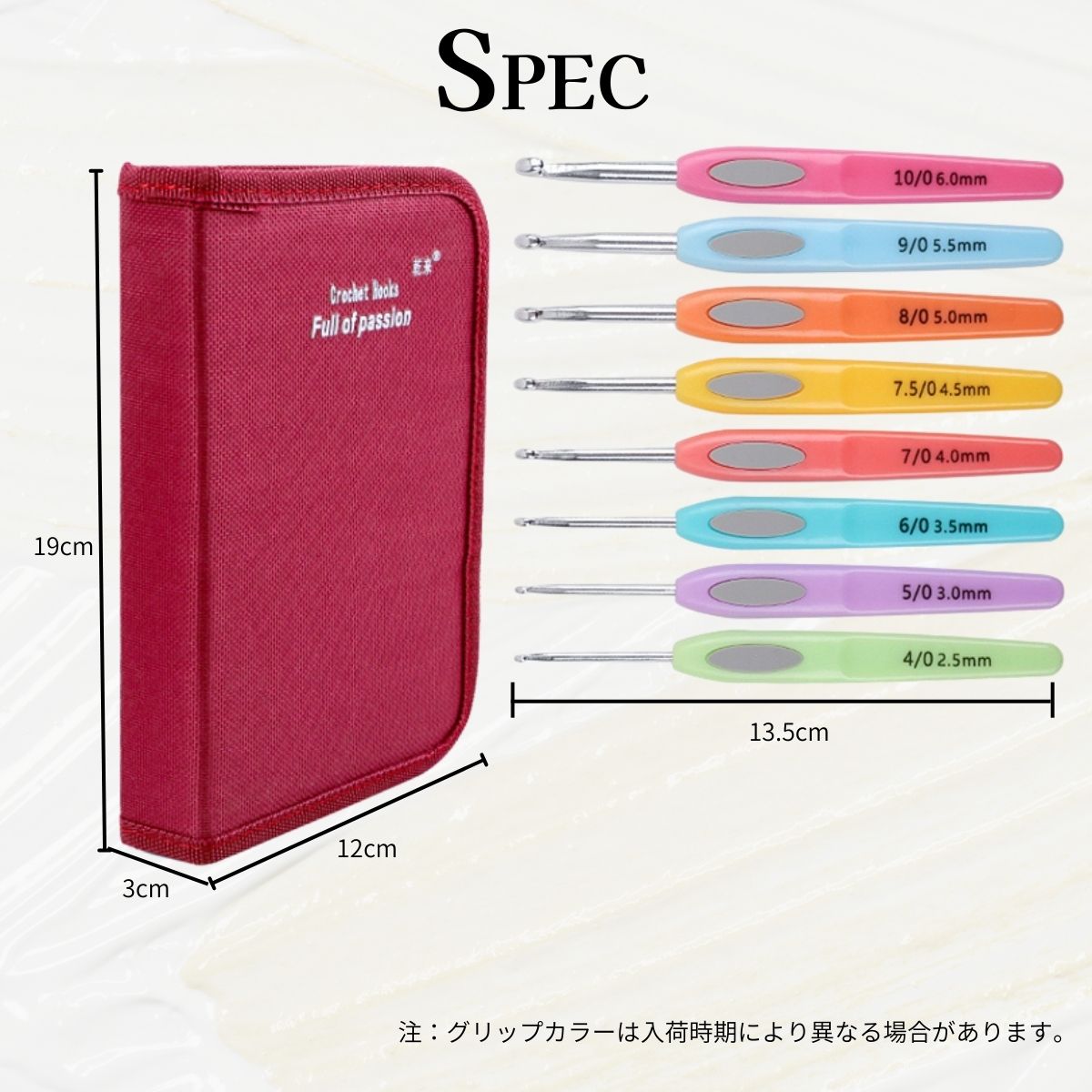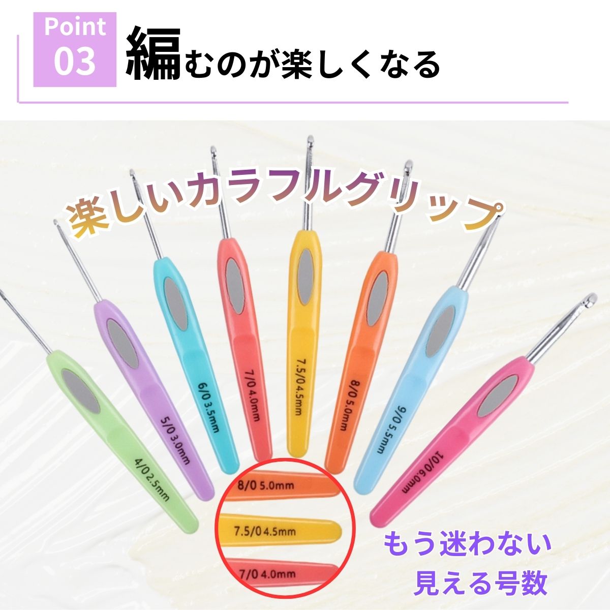 カラフルなグリップが編む楽しさを倍増させます。