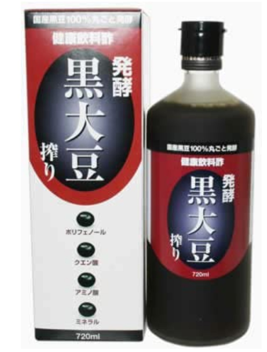 「発酵 黒大豆搾り 720ml」は、従来の酢酸酢とは異なり、画期的な製法で黒豆と米麹から造られたクエン酸酢です。100%国産の黒豆・米麹に水以外何も加えていない無添加です。ポリフェノール、アミノ酸、クエン酸、ミネラルを含んでいます。50-70mlあたりに約20個の国産黒豆が含有されています。また、良質な水を使用し、球磨川上流域の地下水で造られました。クエン酸が主成分なので、刺激が少なくまろやかで飲みやすく、麹米と黒豆本来の自然な甘みがあります。毎日の健康維持等にお役立て下さい。