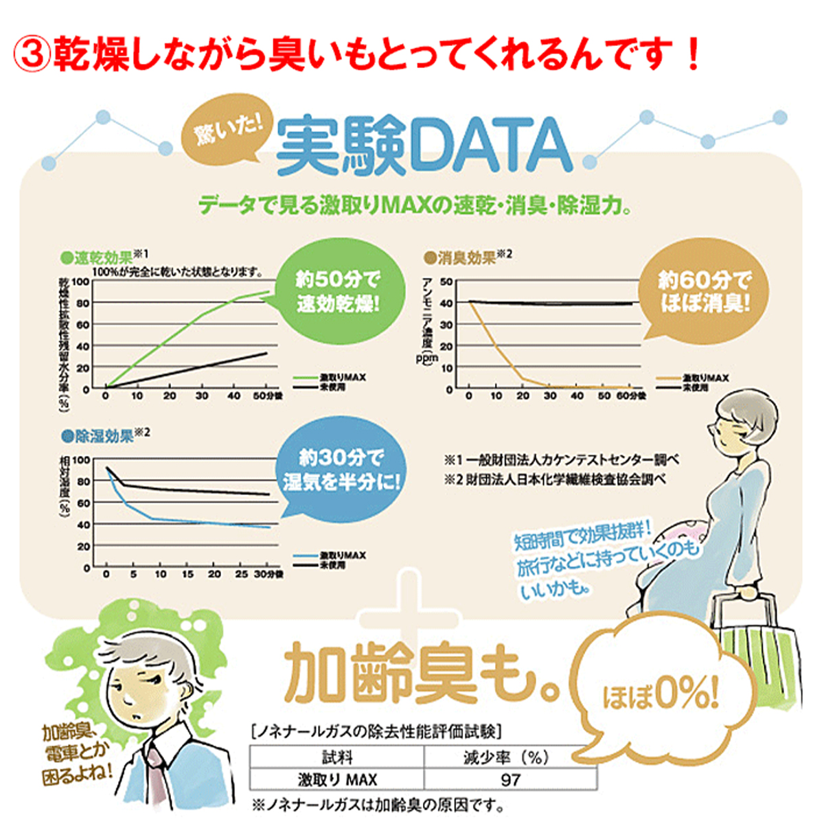 調湿に優れた素材「シリカゲル」によって、約50分で乾燥し、約60分で消臭するというデータが実証されています(※化検調べ)。