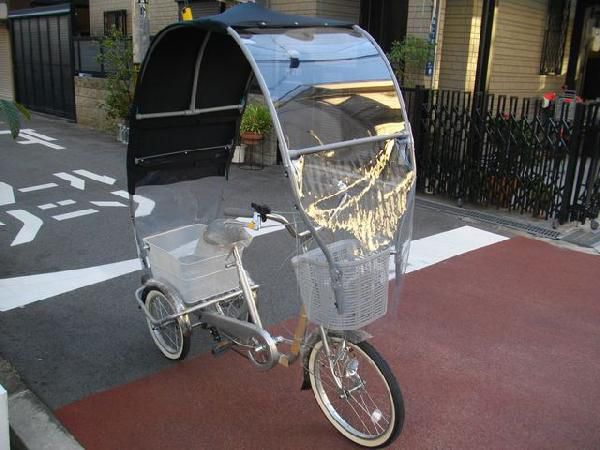●3輪車用の屋根、この商品は高齢者時代を迎えた今、3輪自転車を安全に快適に乗って頂くために開発した商品で、普通、電動アシスト共用の商品です。