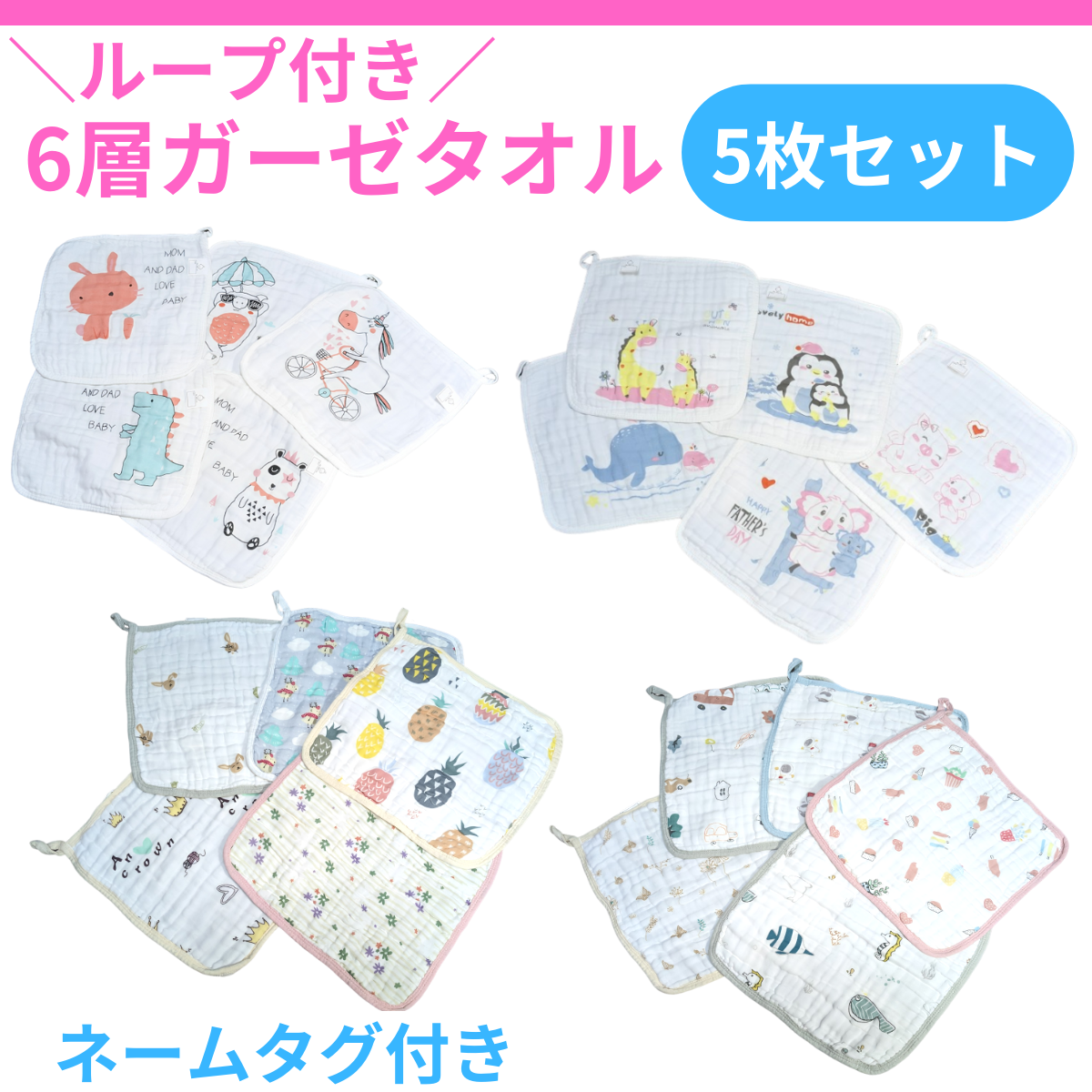 ループ付きタオル 5枚セット ガーゼタオル お手拭きタオル 赤ちゃん ハンドタオル ミニタオル 紐付きタオル 保育園 幼稚園