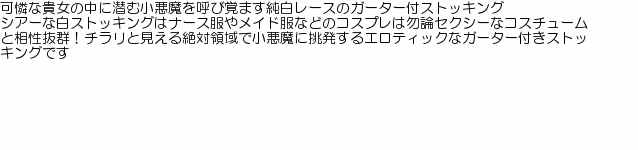 可憐な貴女の中に潜む小悪魔を呼び覚ます純白レースのガーター付ストッキング。シアーな白ストッキングはナース服やメイド服などのコスプレは勿論セクシーなコスチュームと相性抜群!チラリと見える絶対領域で小悪魔に挑発するエロティックなガーター付きストッキングです。