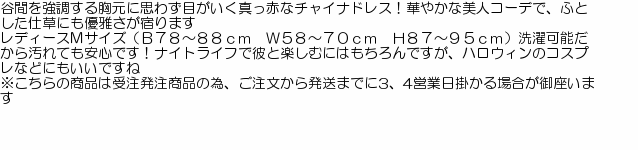 谷間を強調する胸元に思わず目がいく真っ赤なチャイナドレス!華やかな美人コーデで、ふとした仕草にも優雅さが宿ります。レディースMサイズ(B78〜88cm W58〜70cm H87〜95cm)洗濯可能だから汚れても安心です!ナイトライフで彼と楽しむにはもちろんですが、ハロウィンのコスプレなどにもいいですね。※こちらの商品は受注発注商品の為、ご注文から発送までに3、4営業日掛かる場合が御座います。