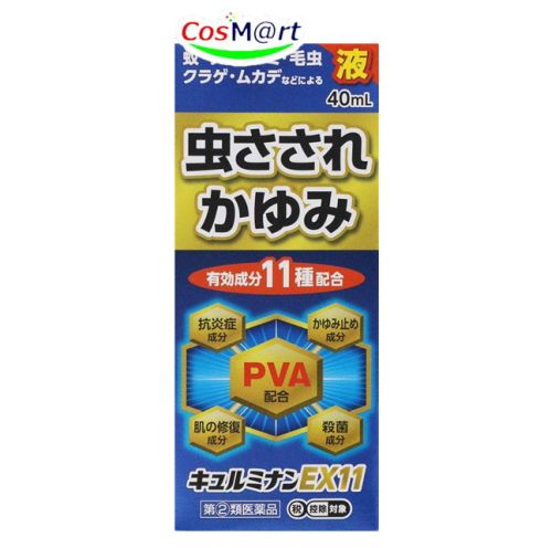 | 【特徴】 | ◎キュルミナンEX11液は、アンテドラッグステロイドを配合したお薬で、11の成分が虫さされのしつこいかゆみや湿疹、かぶれなどにしっかりと効きます。 ◎アンテドラッグステロイドとは プレドニゾロン吉草酸エステル酢酸エステルは、患部で優れた抗炎症作用を発揮しその後、体内に吸収されると作用の弱い物質に分解される特性があります。 ・抗炎症成分:プレドニゾロン吉草酸エステル酢酸エステル、グリチルリチン酸二カリウム、サリチル酸グリコール ・かゆみ止め成分:ジフェンヒドラミン塩酸塩、クロタミトン |