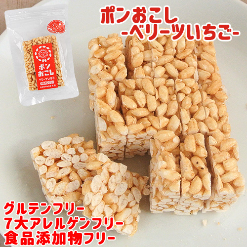 昔ながらのポン菓子を固めたおこしです。特定原材料7品目を一切使用せず、食品添加物も使用しておりません。大分県産いちごベリーツを100%使用しています。甘酸っぱいいちごの風味をお楽しみいただけます。サクサクした食感で食べやすいです。