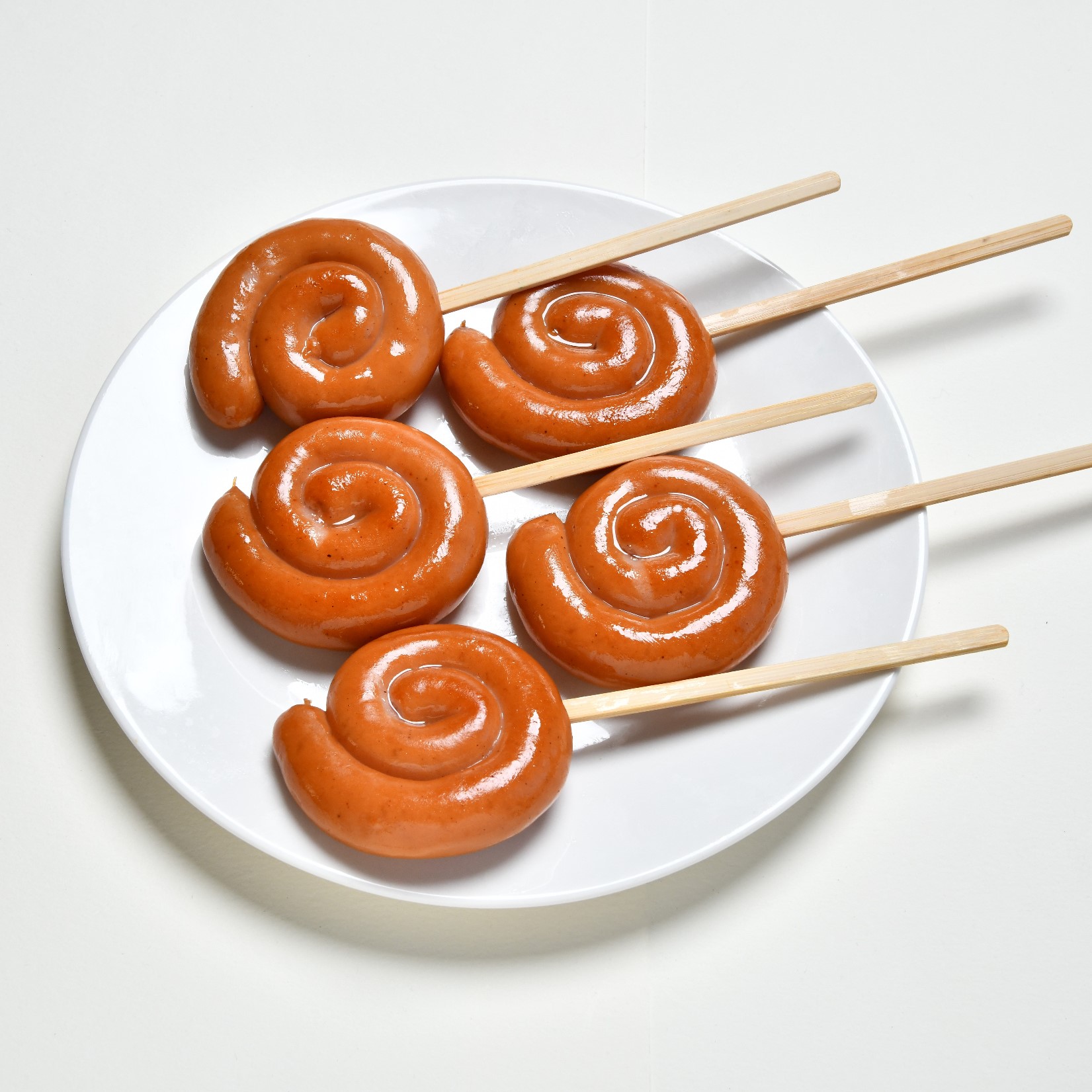こだわりのオリジナルレシピで作ったソーセージをグルグルに巻き、串に刺したキャンディのような商品で、天然羊腸を使用していますので、パリッとした食感が楽しめる商品です。