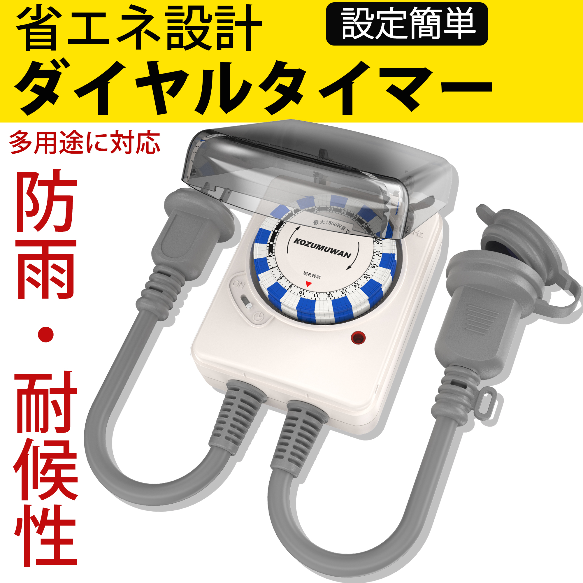| ●本機はギア式ですので、1日に最大10分程度の誤差が生じる場合があります。また、入/切動作時に最大5分程度の誤差が生じる場合があります。 ●延長コードを使用する場合、必ず屋外用の延長コードを使用してください。 ●本機に延長コードをつなぐ時は、延長コードの最大ワット数を越えないようにしてください。 ●使用する機器を延長コードを用いて複数つなぐ場合、その機器の合計W数が、使用できるW数を超えないように注意してください。その場合、合計が1500W以下の場合があります。 容量をオーバーすると火災の原因となることがあります。 ●延長コードを使用する電気器具のコードの接合部分(平型キャップ/プラグ等)は、必ず防水テープ(自己融着絶縁テープ)等で防水加工をしてください。 雨水などが浸入すると漏電や故障の原因となります。 ●1000W以上の器具を使用する時は、単独で使用してください。 |