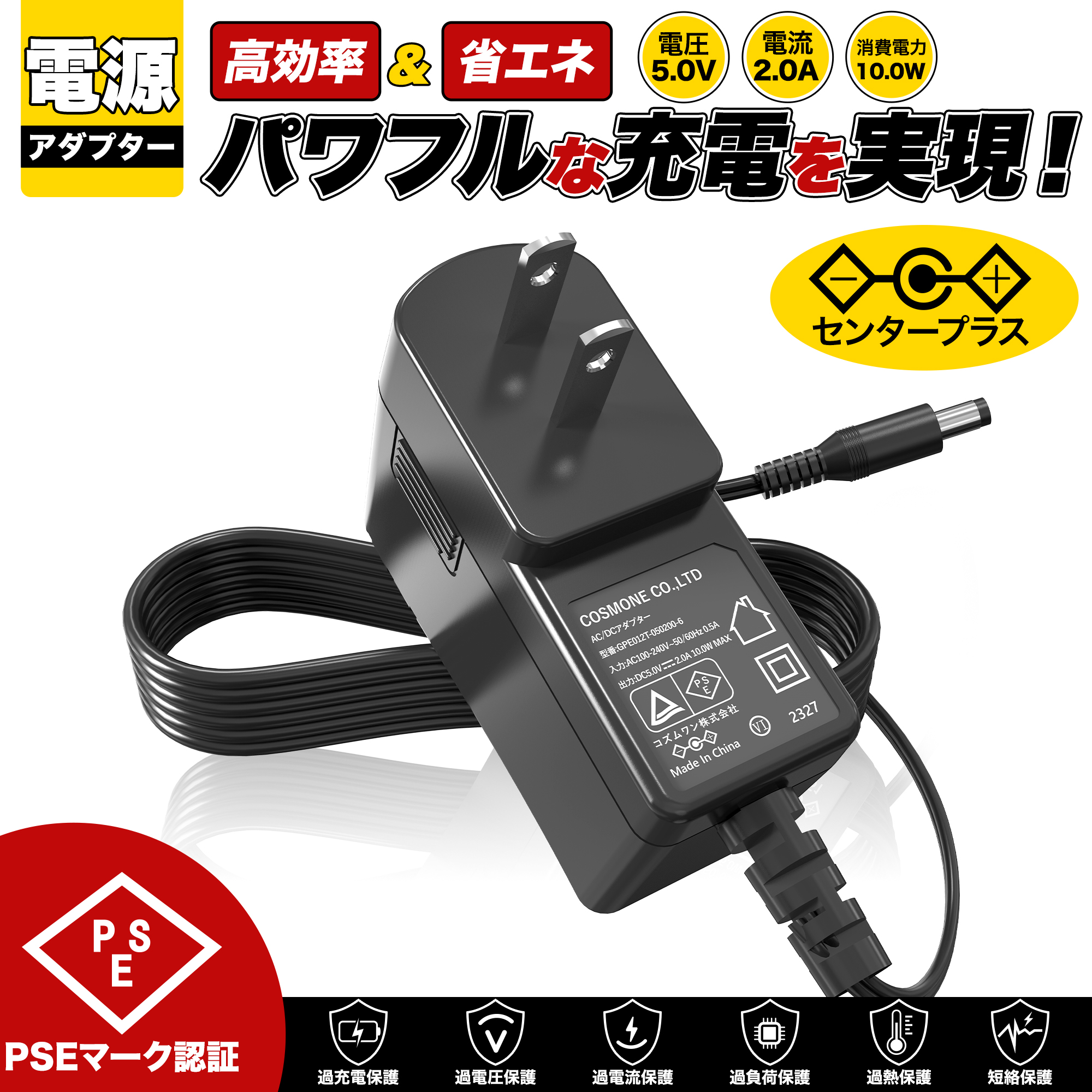 汎用ACアダプター 5V 2A 最大出力10W PSE取得品 出力プラグ外径5.5mm(内径2.1mm) 1年保証付