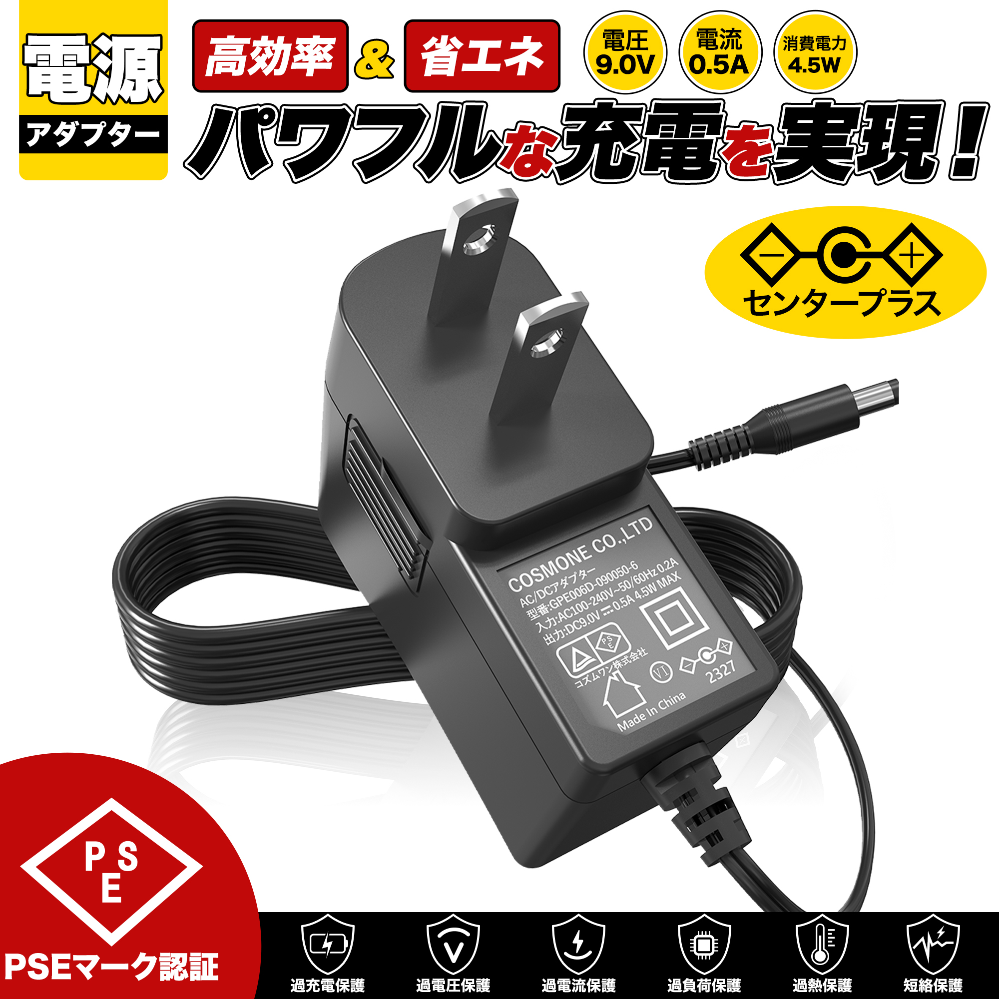 汎用ACアダプター 9V 0.5A 最大出力4.5W PSE取得品 出力プラグ外径5.5mm(内径2.1mm) 1年保証付