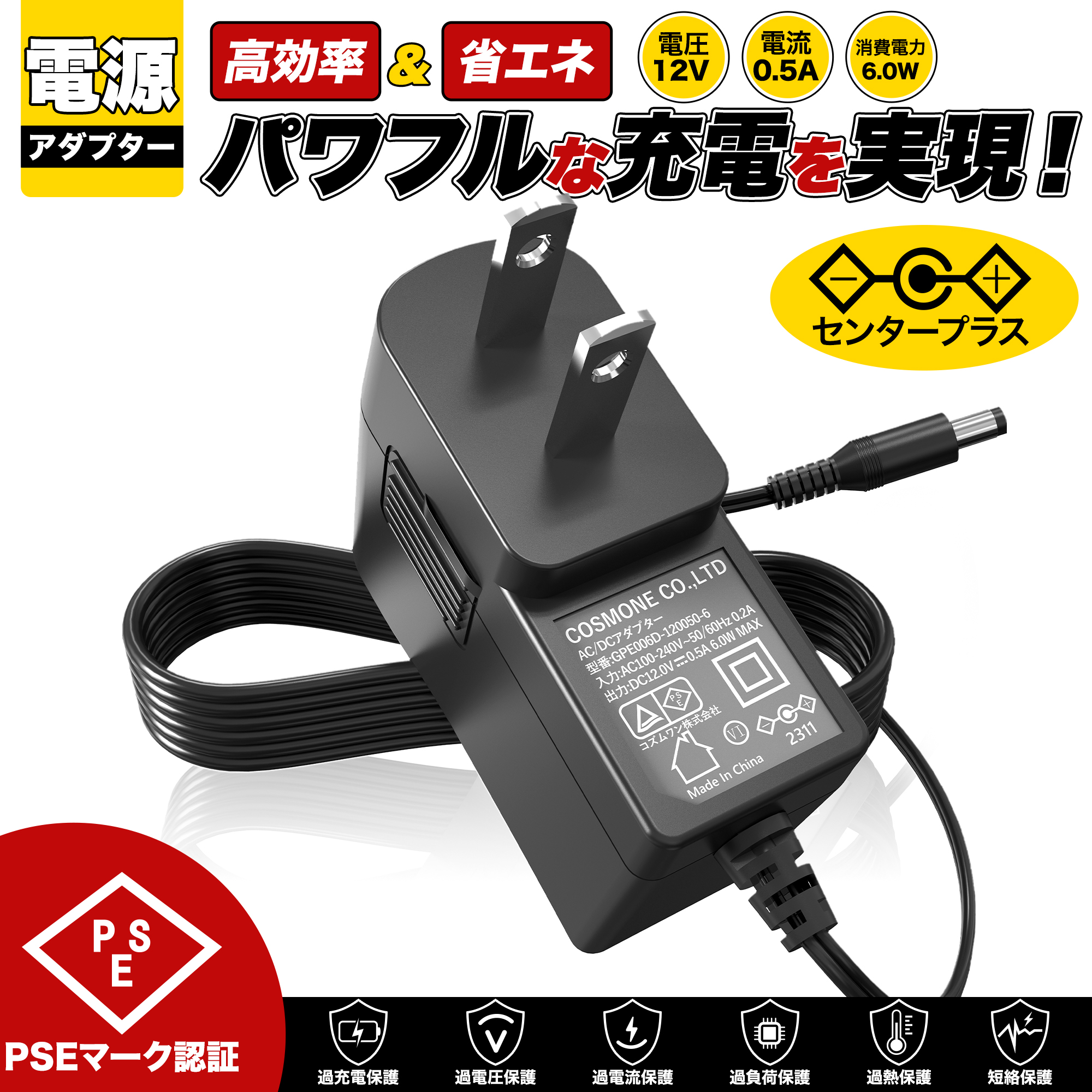 汎用ACアダプター 12V 0.5A 最大出力6W PSE取得品 出力プラグ外径5.5mm(内径2.1mm) 1年保証付