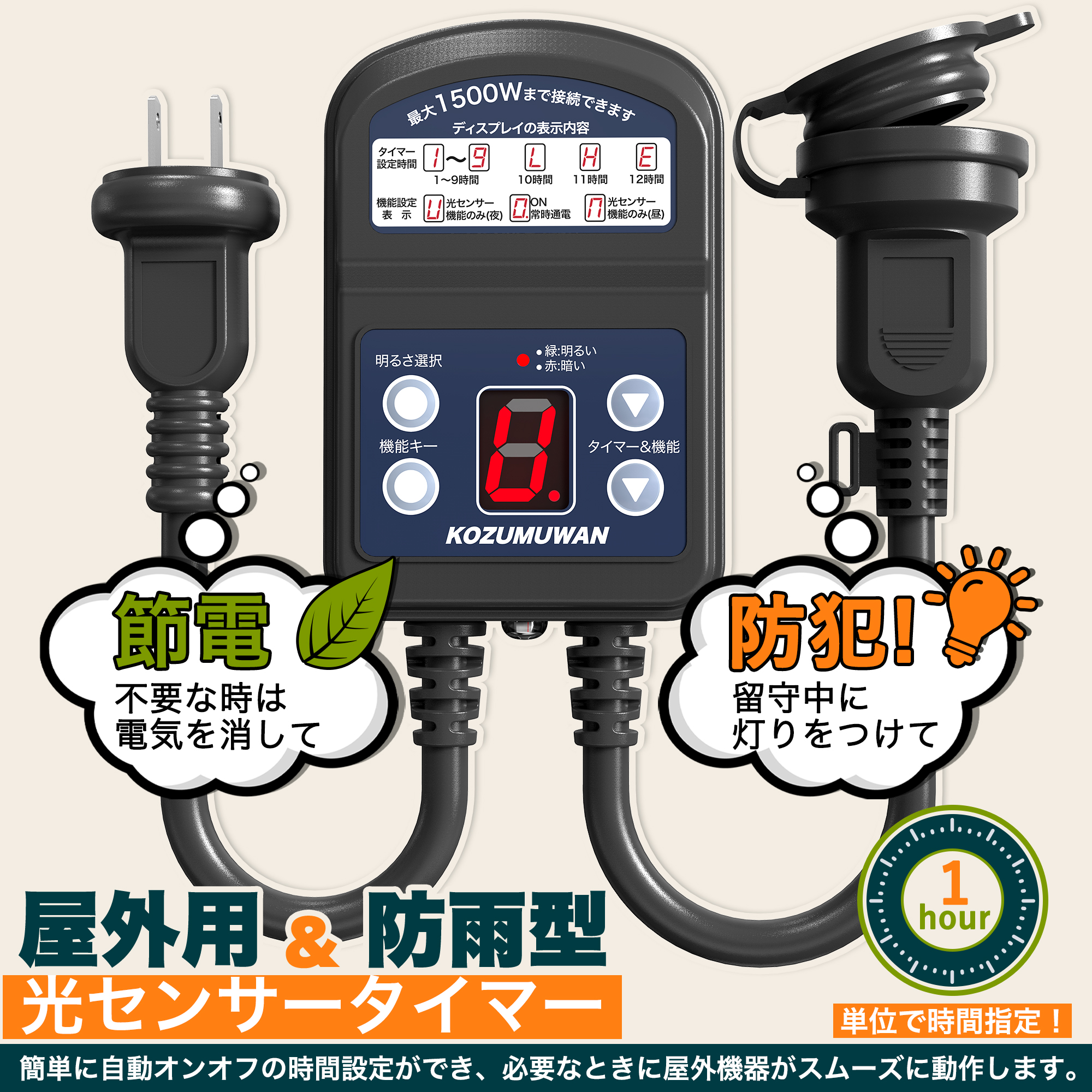 防雨型タイマー 光センサー付き タイマーコンセント 防水 12時間 最大1500W 屋外用 消灯時間設定 自動点灯 装飾灯 ガーデンライト 玄関灯 防犯灯 照明器具