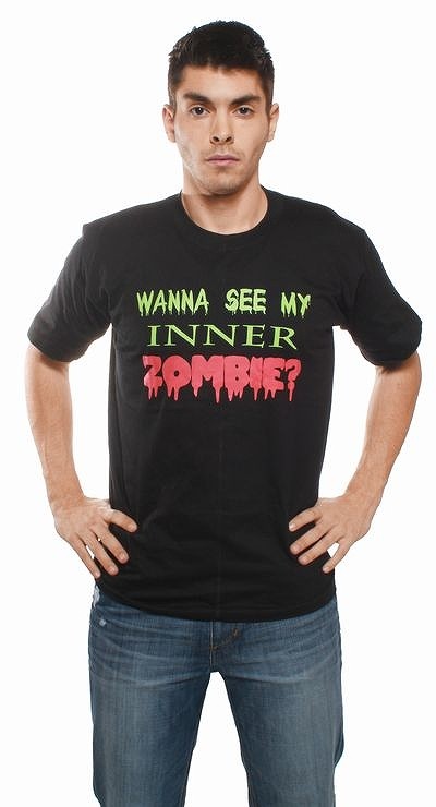 胸のプリントを読むと…「Wanna See My Inner Zombie?」直訳すると、「私の内部ゾンビを見たいですか?」の文字!