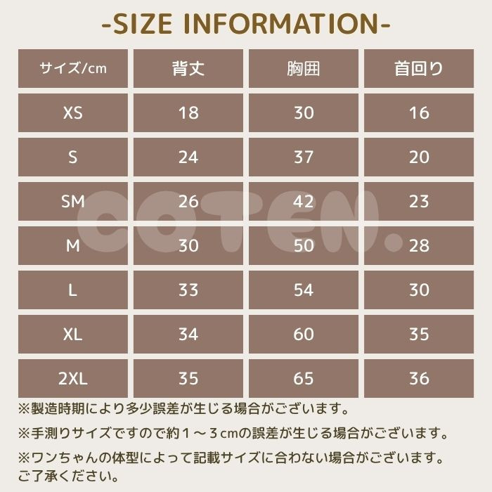 XL:背丈34cm,胸囲60cm,首回り35cm