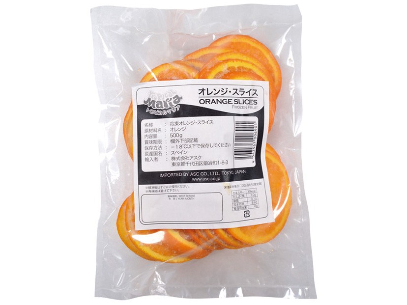 スペイン産のオレンジを輪切りにして急速冷凍しています。