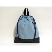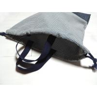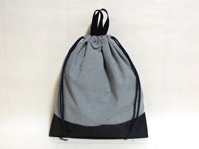 両絞りの巾着袋。底部分がデニム地と二重になっており、丈夫な作りです。