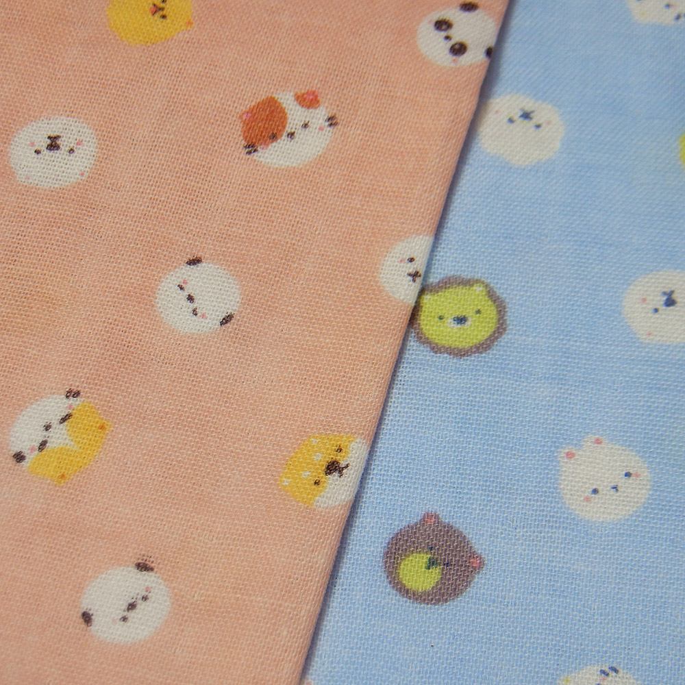 ライオン、くま、うさぎ、シマエナガ、猫、パンダなどのかわいい動物たちの顔のプリントのダブルガーゼ生地。