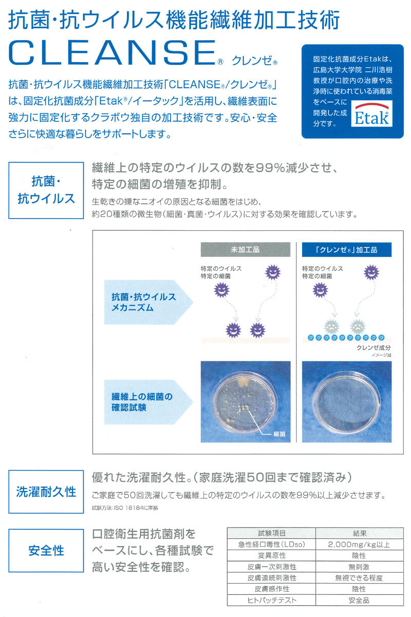 抗菌・抗ウイルス機能繊維加工技術「CLEANSE®/クレンゼ®」は、固定化抗菌成分「Etak®/イータック」を活用し、繊維表面に強力に固定化するクラボウ独自の加工技術です。