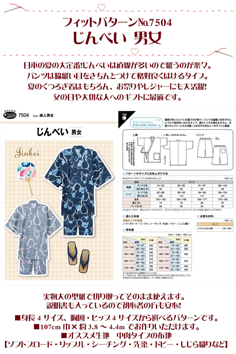 実物大・型紙 フィットパターン じんべい 男女