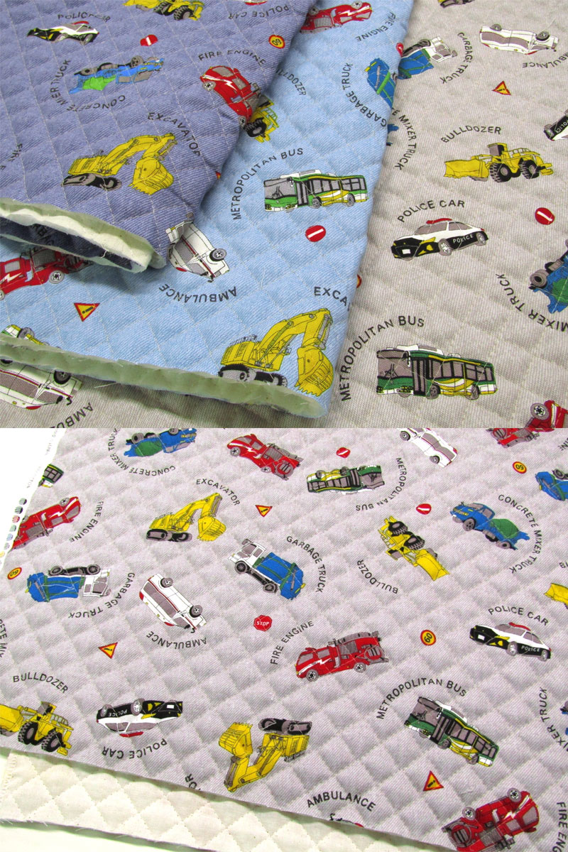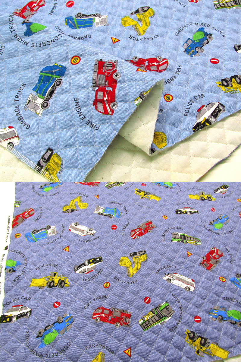 パトカー、消防車、バスやショベルカーなど、カッコイイ車両がたくさん描かれたプリント生地です。