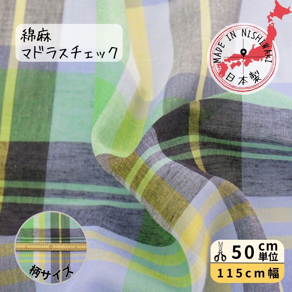 生地 チェック 麻混 115cm巾 50cm単位カット 切り売り ブルーチェック マドラスチェック 春色 初夏におすすめ 薄地 ハンドメイド 手芸 布 はぎれ