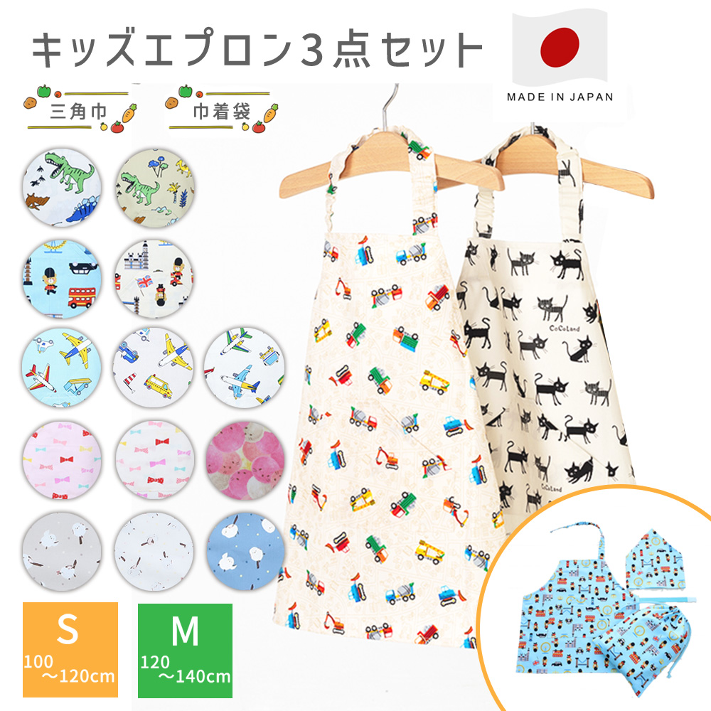 フジキ キッズ エプロン 3点セット エプロン 三角巾 セット 巾着袋 子供用エプロン 日本製 マジックテープ式 保育園 小学校