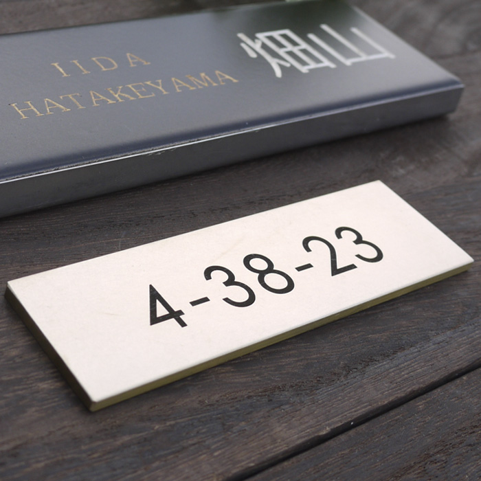 真鍮製の番地プレートは、3mm厚の重厚なイメージで、100x30mmのサイズになります。