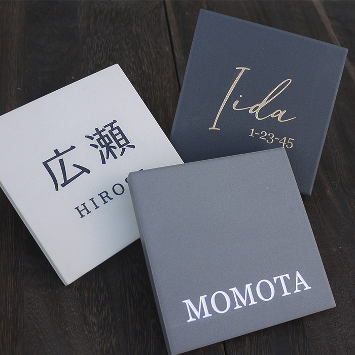 無軸でマットなタイルを彫刻した表札で、ブラック・グレー・アイボリーをご用意。
