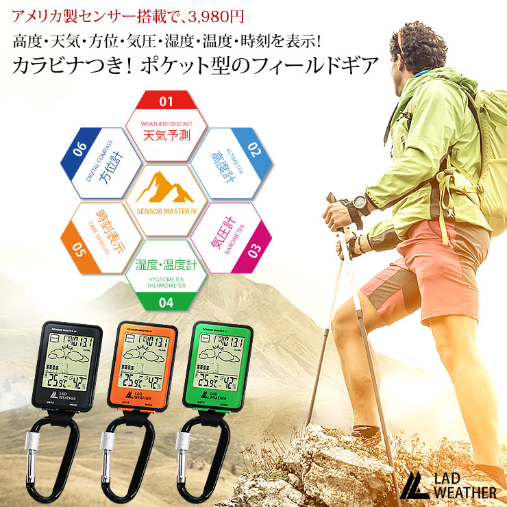 高度・天気・方位・気圧・湿度・温度・時刻を表示!カラビナつき! ポケット型のフィールドギア lad036