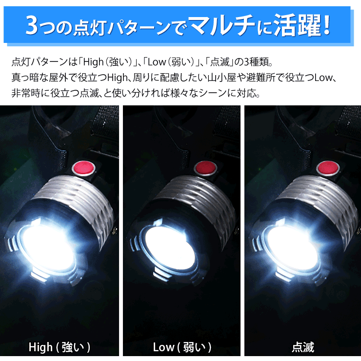 点灯パターンは「High(強い)」、「Low(弱い)」、「点滅」の3種類。