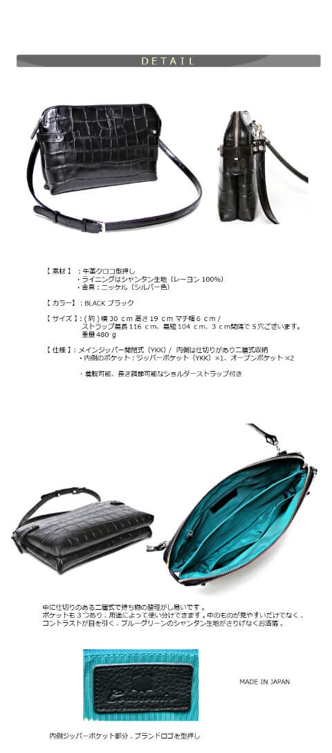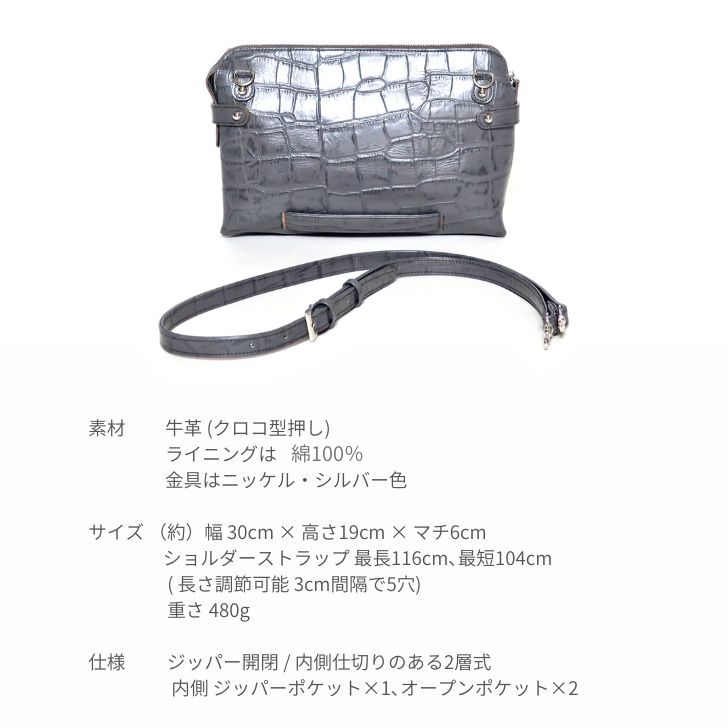 【 サイズ 】(約) 横幅30cm 本体高さ19cm マチ幅 6cm / ストラップ最長116cm、最短104cm、3cm間隔で5穴 / 重さ 約480g