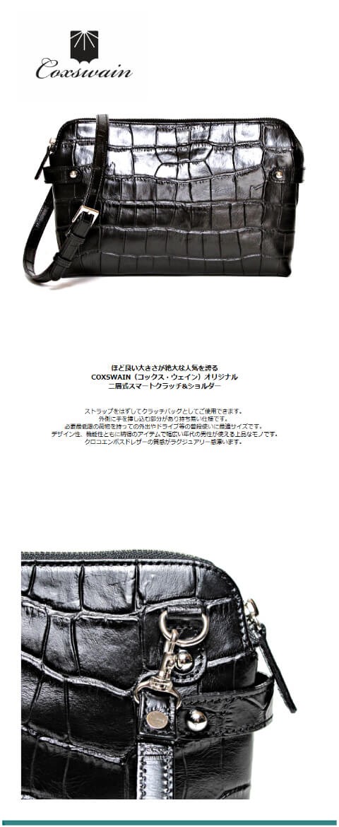 ほど良い大きさが絶大な人気を誇るCOXSWAINオリジナル二層式スマートクラッチ&ショルダー。ストラップを外してクラッチバッグとして。外側に手を挿し込む部分があり持ち易い仕様。必要最低限の荷物を持っての外出やドライブ等の普段使いに最適サイズ。デザイン性、機能性ともに納得のアイテムで幅広い年代が使える上品なモノです。クロコダイルの型押しと素材の質感でラグジュアリー感漂います。ギフト プレゼント 誕生日 バレンタイン クリスマス 父の日 お祝い 男性 肩掛け 斜め掛け ショルダーストラップ付