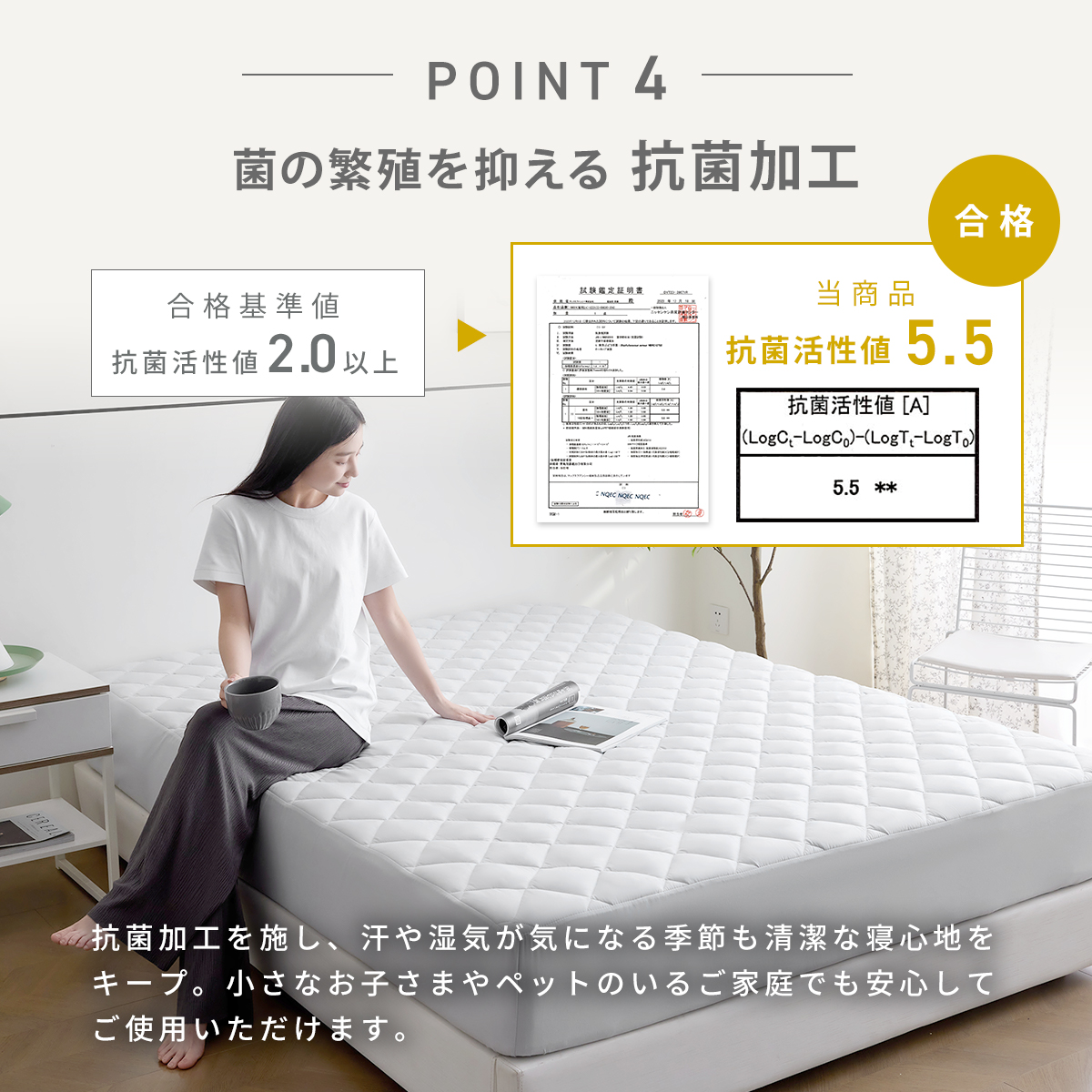 中綿には抗菌防臭加工を施し、抗菌活性値は基準値を大きく上回る「5.5」を記録。
