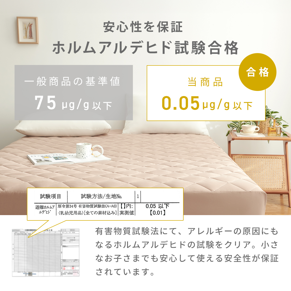 厚生省令第34号の基準をクリアした、ホルムアルデヒド値「0.05以下」の安全性。