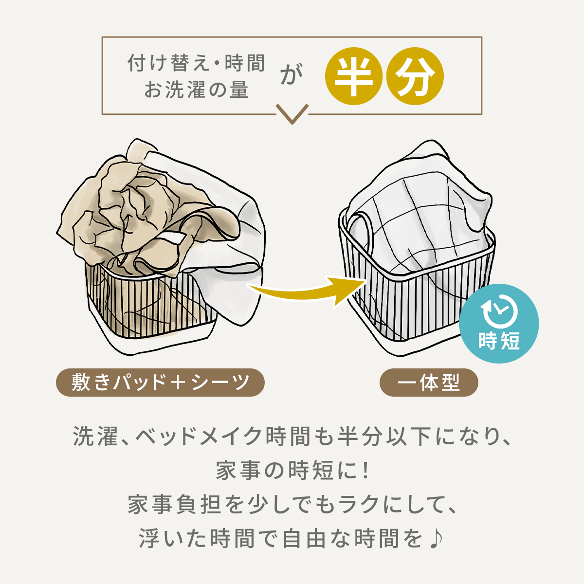 敷きパッドとシーツを別々に洗う必要がないので、