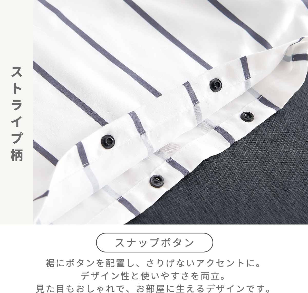 ストライプ柄は、ファスナーではなく「スナップボタン仕様」を採用。