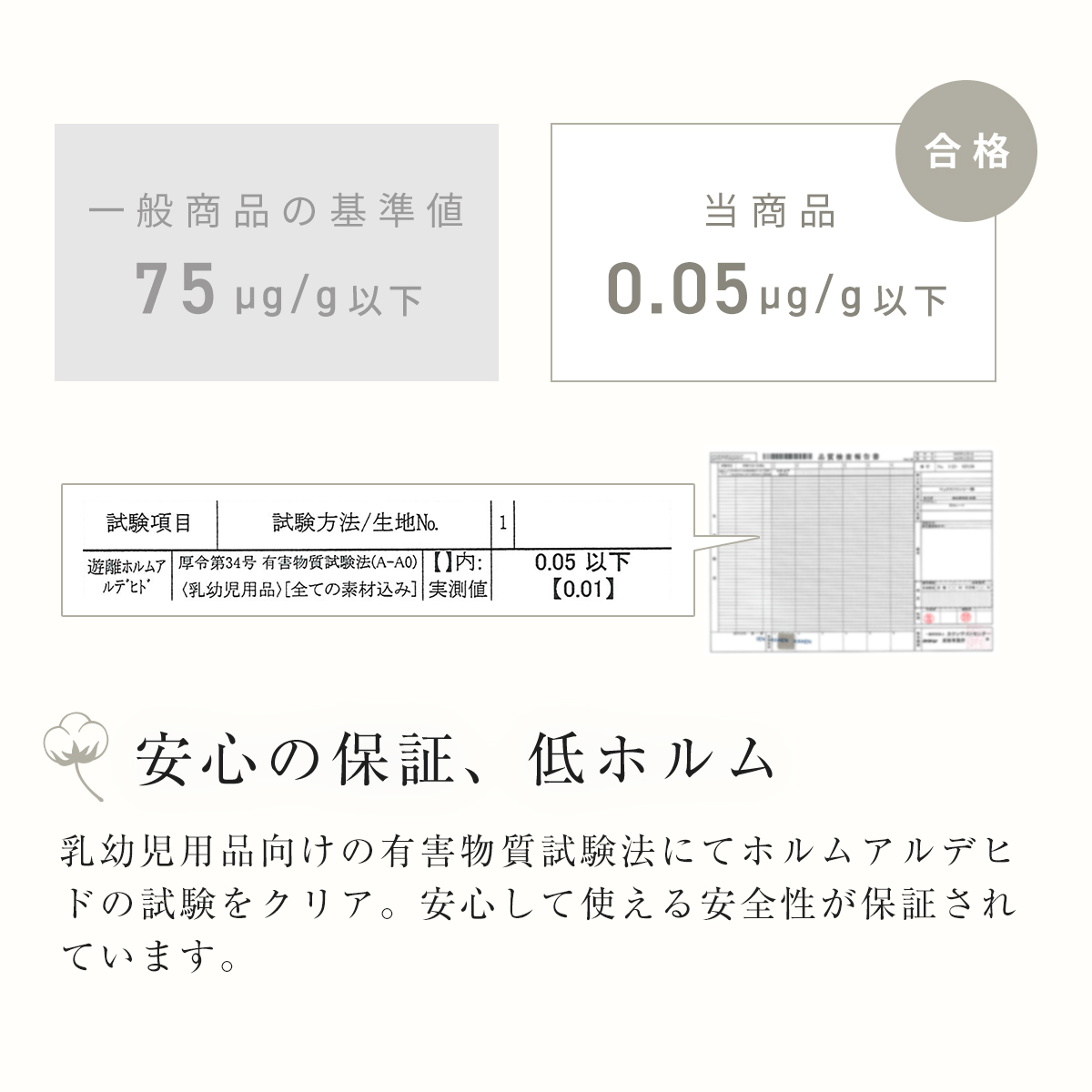 乳幼児用品向けの有害物質試験法にてホルムアルデヒドの試験をクリア(0.05以下)。