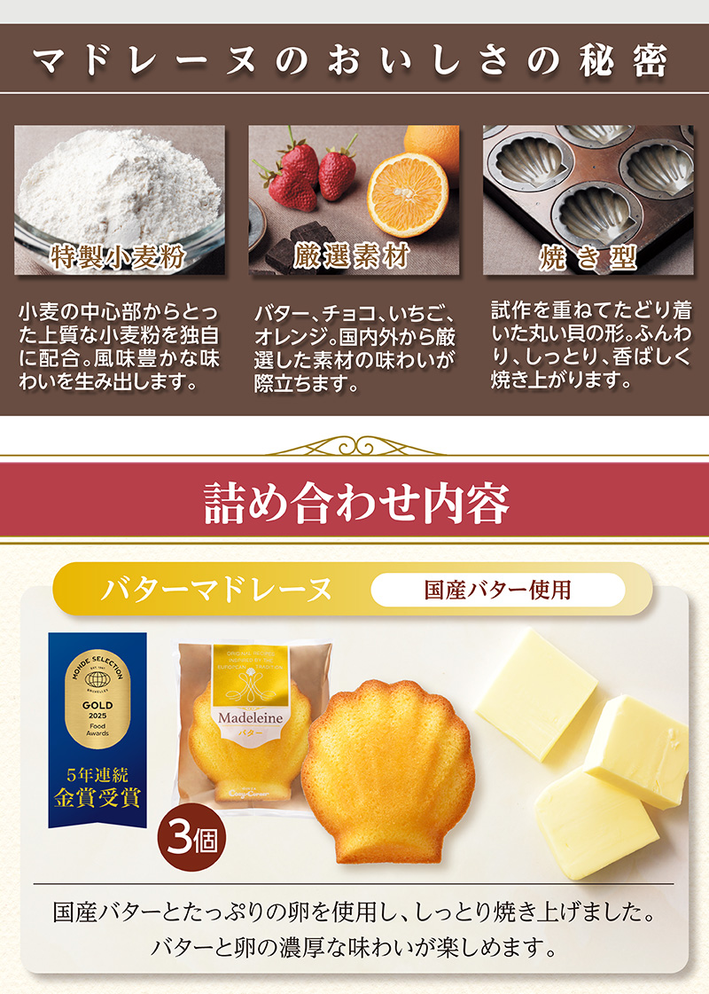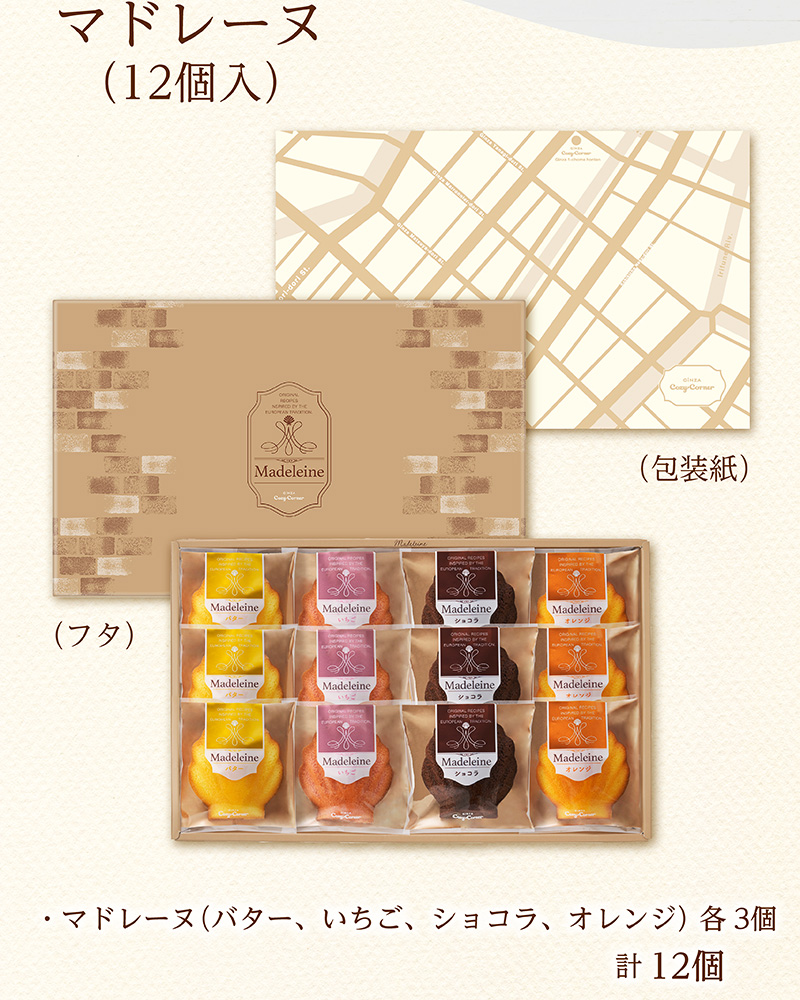 ■内容量:いちごマドレーヌ・オレンジマドレーヌ・ショコラマドレーヌ・バターマドレーヌ 各3個