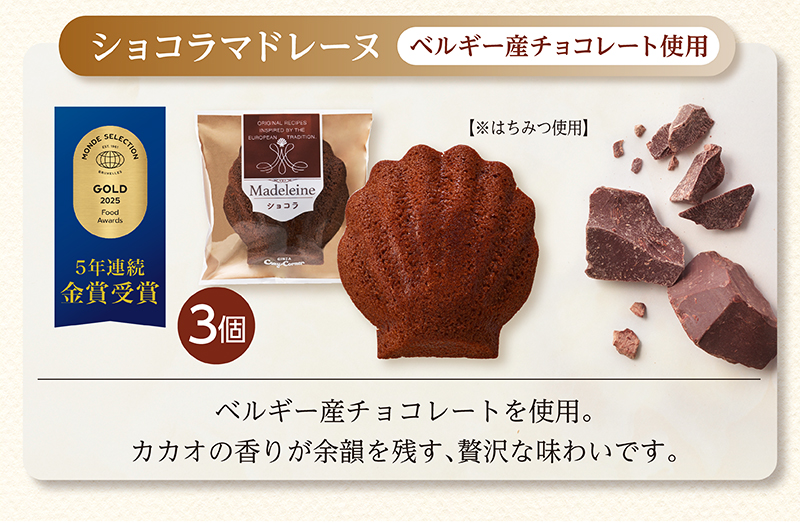 ※ショコラマドレーヌには原材料の一部にはちみつを使用しておりますので、一歳未満の乳児には食べさせないでください。