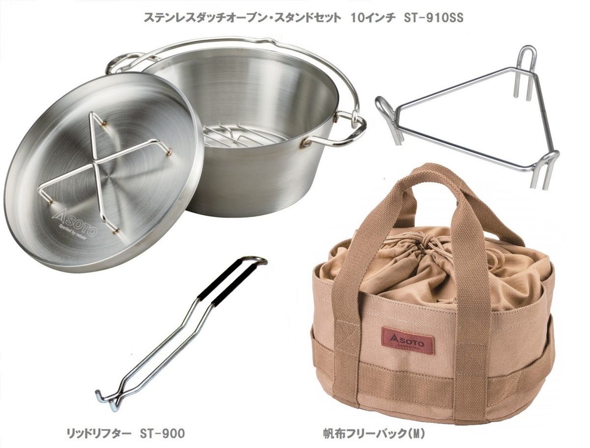 ステンレスダッチオーブン10インチに、熱くなったなった本体やリッドを置く事のできるSOTOオリジナルのスタンドと2020新商品の帆布フリーバッグ(M)、ステンレスダッチオーブンのフタを持ち上げるためのリフターの付いたセットです。底網ST-910NTも付いてます。