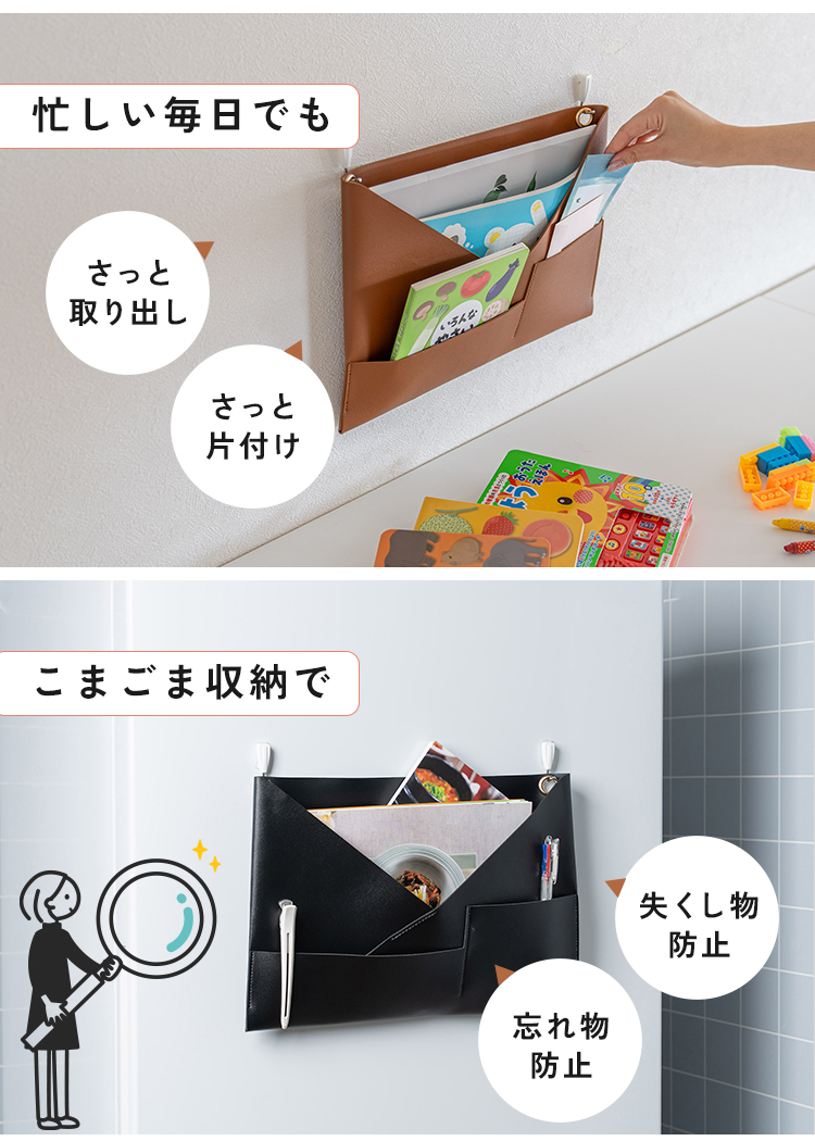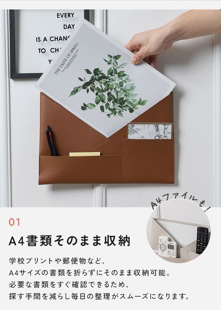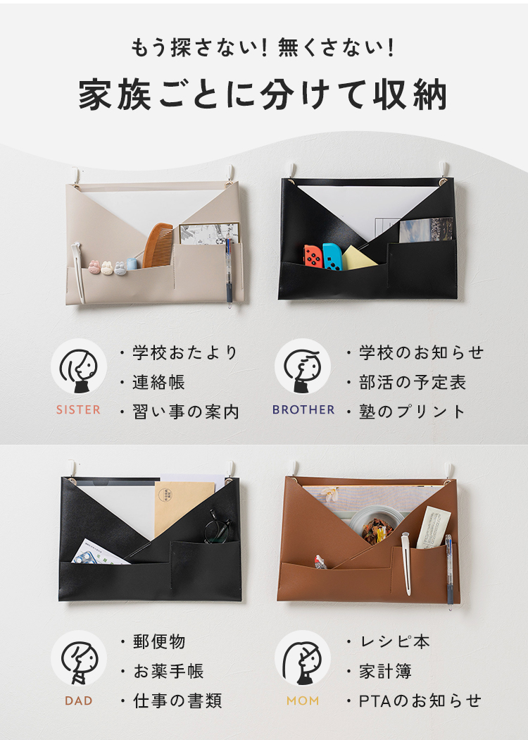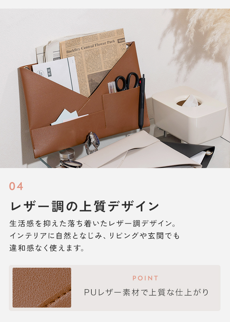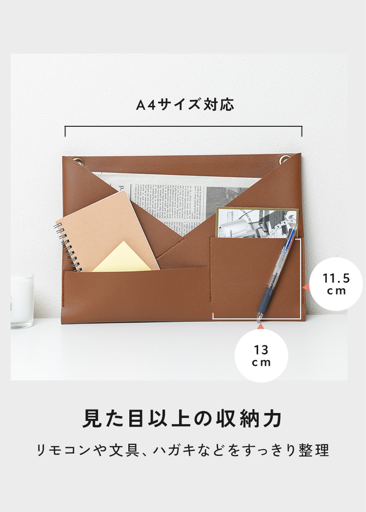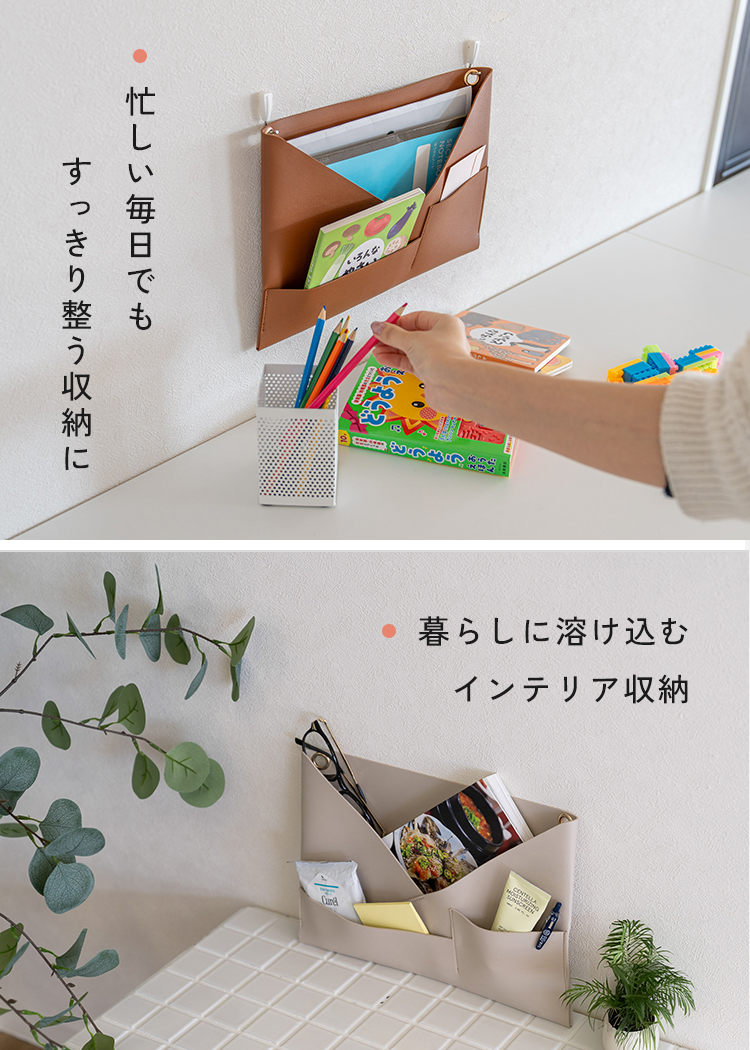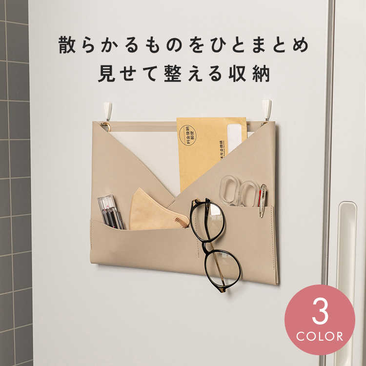 | 郵便物や学校プリント、DMなど気づくと増える紙類を、壁に掛けるだけですっきり整理。 A4サイズ対応で折らずに収納でき、見やすく管理できます。 レザー調の上質デザインでインテリアにもなじみ、リビングや玄関でも違和感なく使えます。 バッグインバッグとして持ち運びも可能です。 |