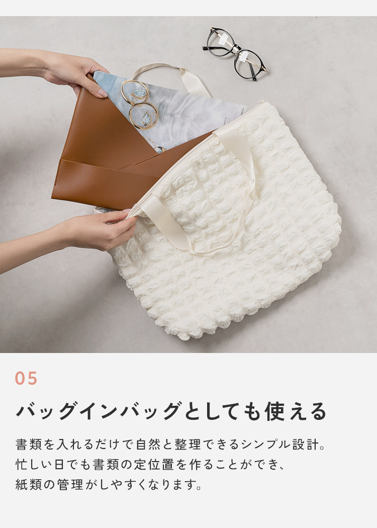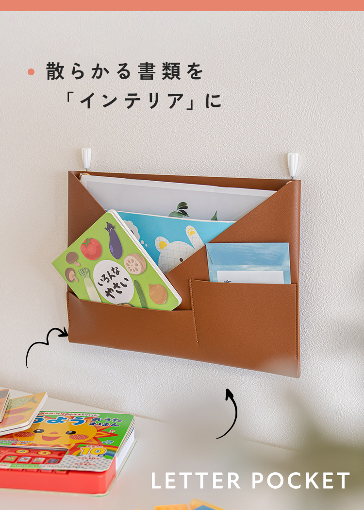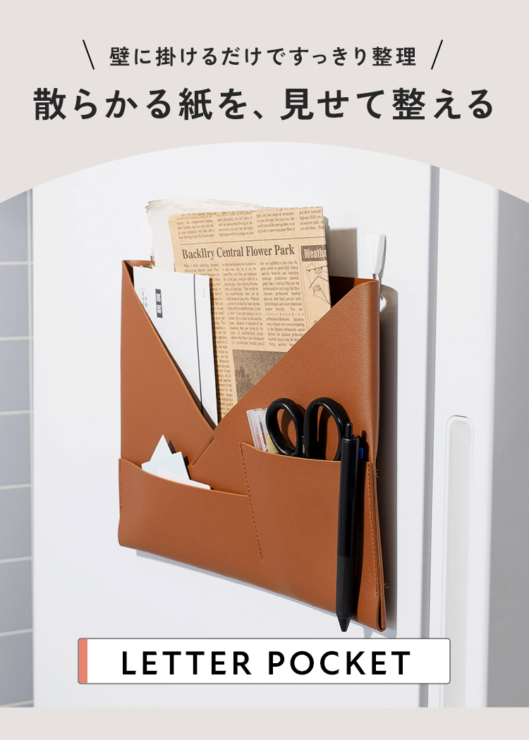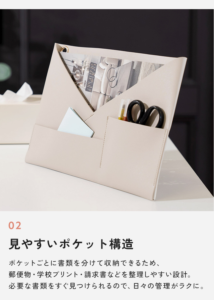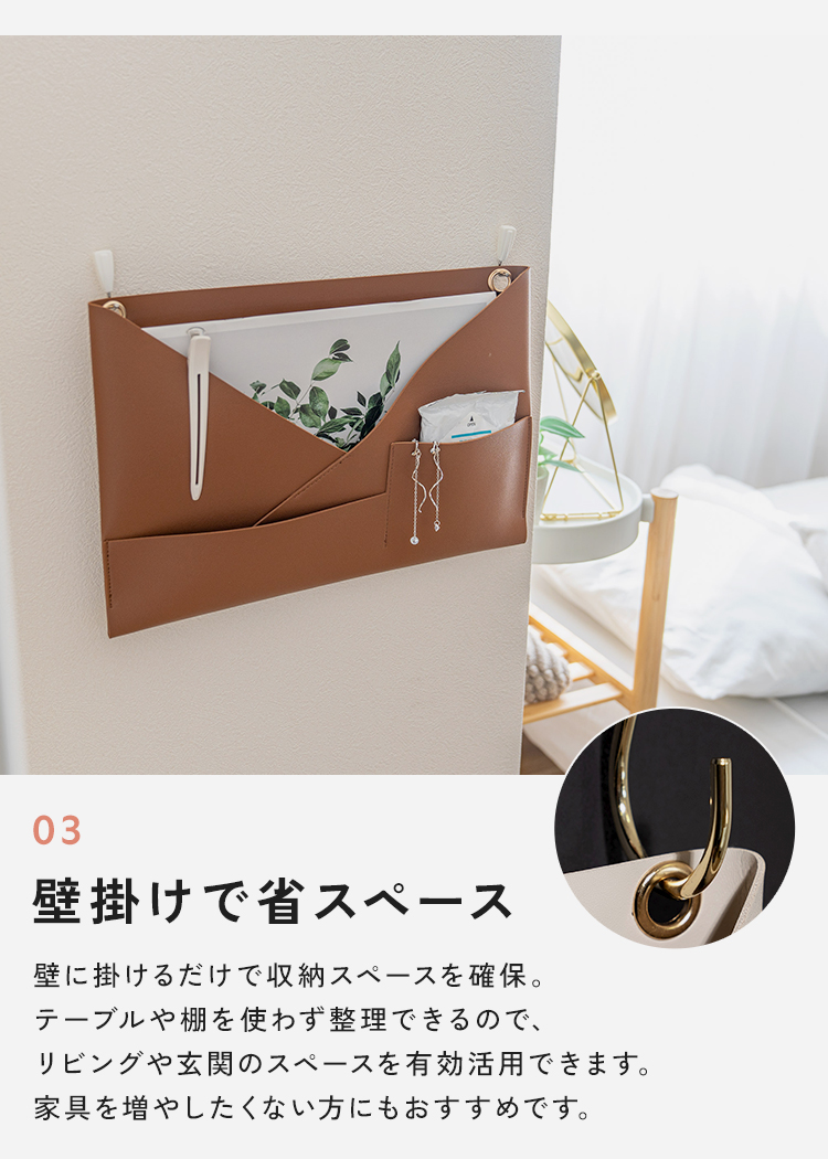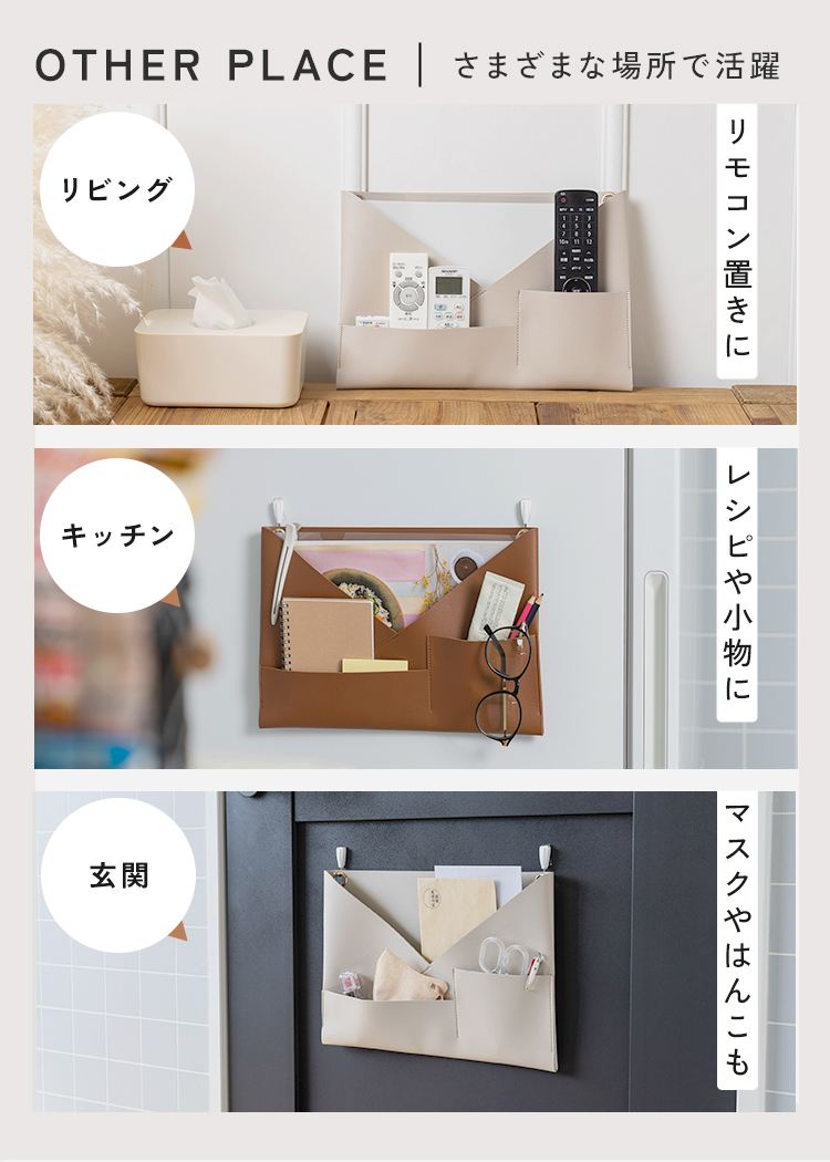 | 郵便物や学校プリント、DMなど気づくと増える紙類を、壁に掛けるだけですっきり整理。 A4サイズ対応で折らずに収納でき、見やすく管理できます。 レザー調の上質デザインでインテリアにもなじみ、リビングや玄関でも違和感なく使えます。 バッグインバッグとして持ち運びも可能です。 |