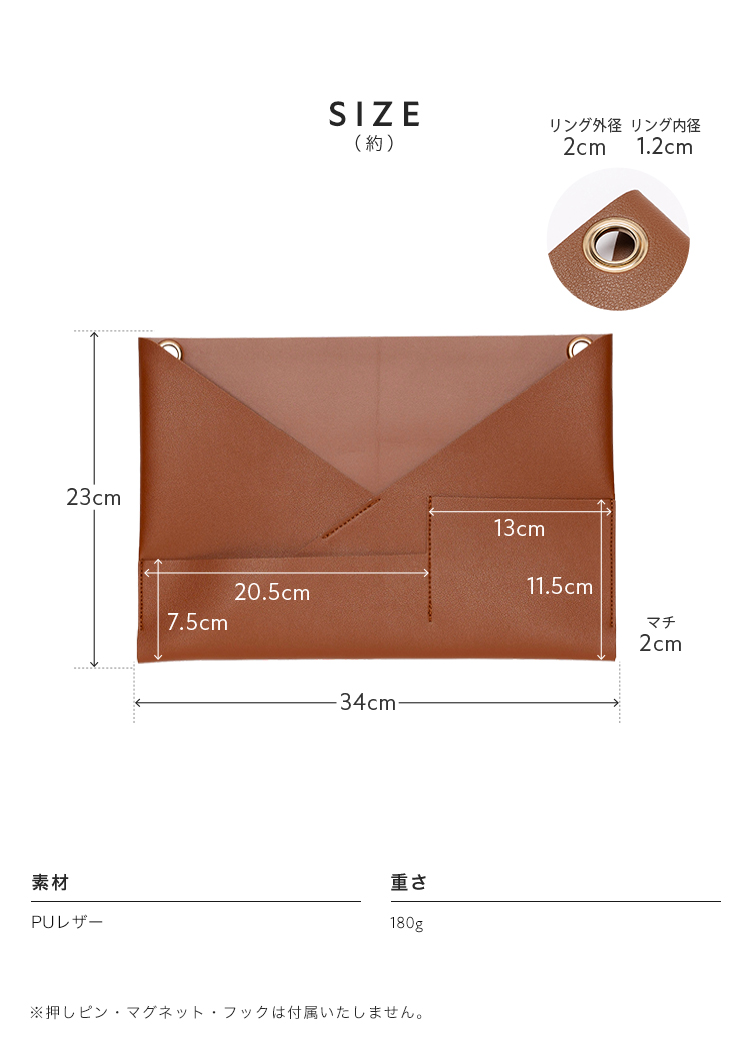 | 全体:約 W34cm×H23cm マチ:約 2センチ 外径:約 2cm 内径:約 1.2cm |