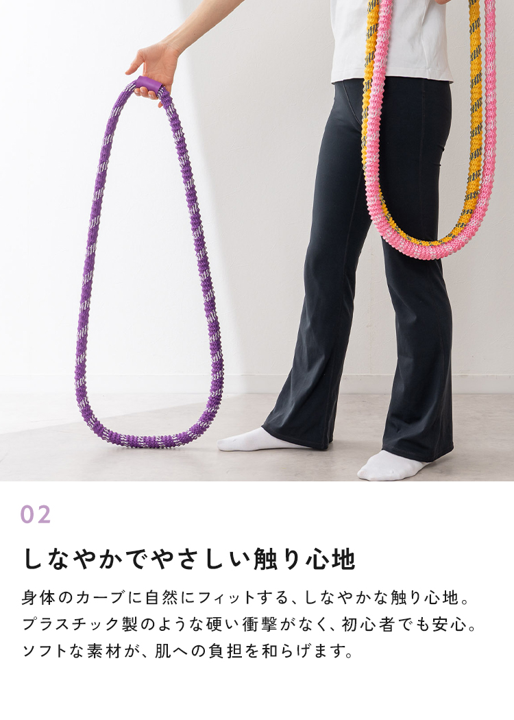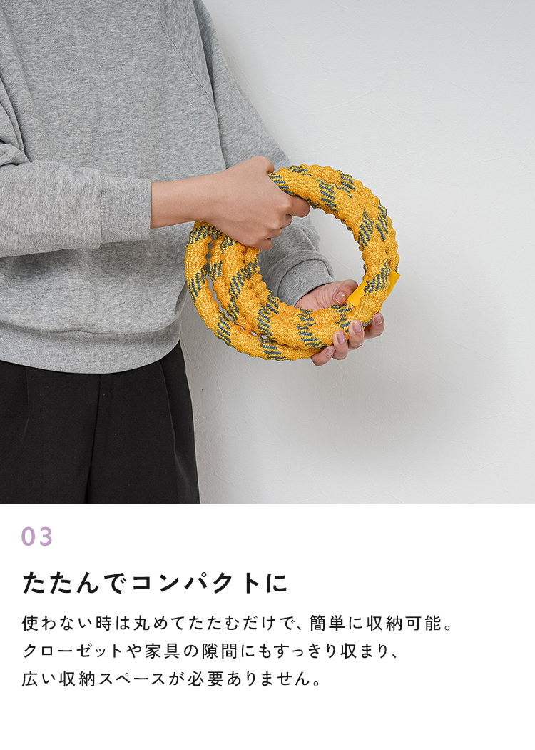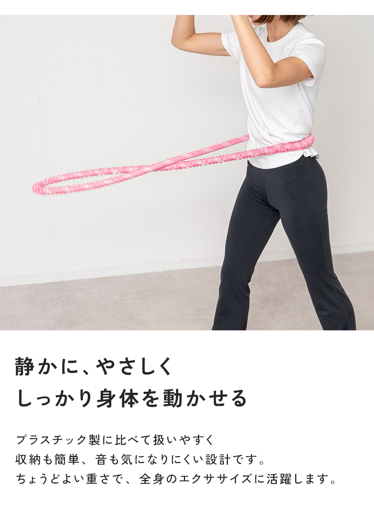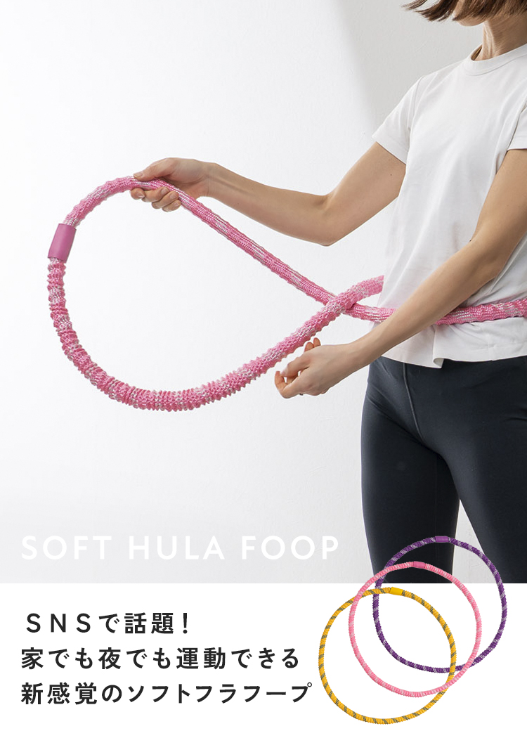 | SNSでも話題のソフトフラフープ。プラスチック製に比べて扱いやすく、やわらかいのでケガの心配も少なくなっています。しっかりとした1.5kgの重さで短時間でも効率の良い運動が可能。丸めてたたむことが出来るので、収納も簡単。静音設計で、お子様や家族が寝た後や、マンションでも周りを気にせず運動することができます。 |