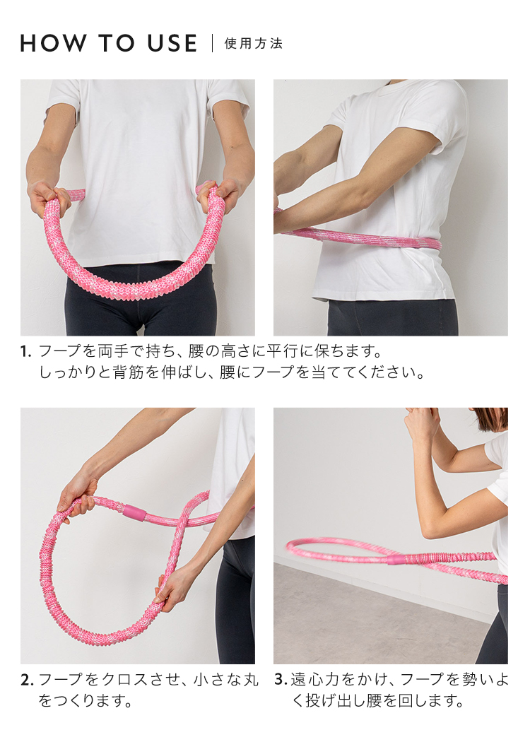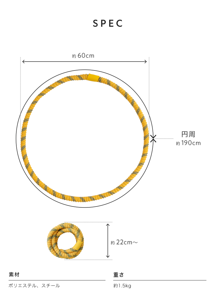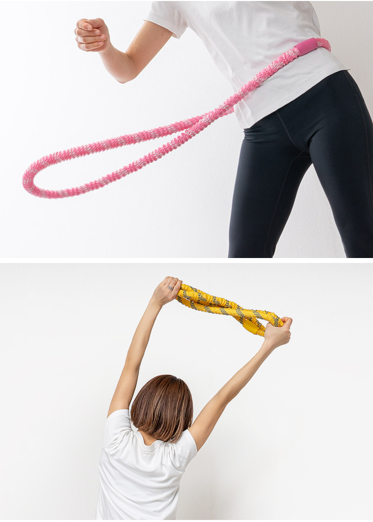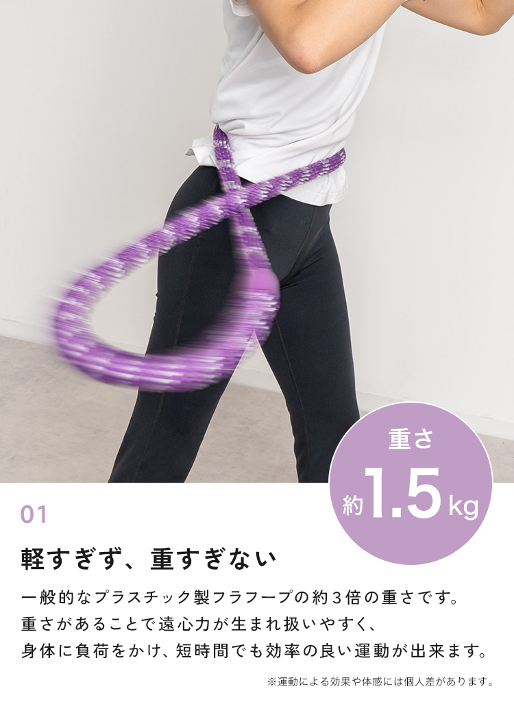 | SNSでも話題のソフトフラフープ。プラスチック製に比べて扱いやすく、やわらかいのでケガの心配も少なくなっています。しっかりとした1.5kgの重さで短時間でも効率の良い運動が可能。丸めてたたむことが出来るので、収納も簡単。静音設計で、お子様や家族が寝た後や、マンションでも周りを気にせず運動することができます。 |