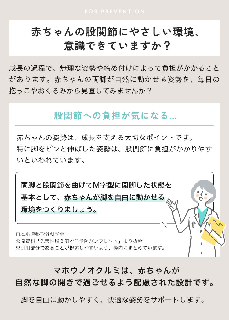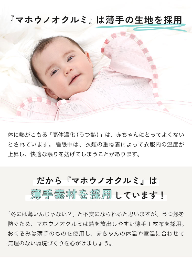 | 商品説明 | 保育士監修のもと日本企業がプロデュースした『マホウノオクルミ』 赤ちゃんが理想の体型でぐっすりと眠れるように、 自然と手がW、足がM字になる形のおくるみです。 手がすっぽりと覆われるので、指しゃぶりや顔の引っ掻きを防ぎます。 股関節の発達をサポートできるよう足元にはたっぷりと余裕を持たせたデザインです}。 成長に合わせて使える2サイズ展開です。 |