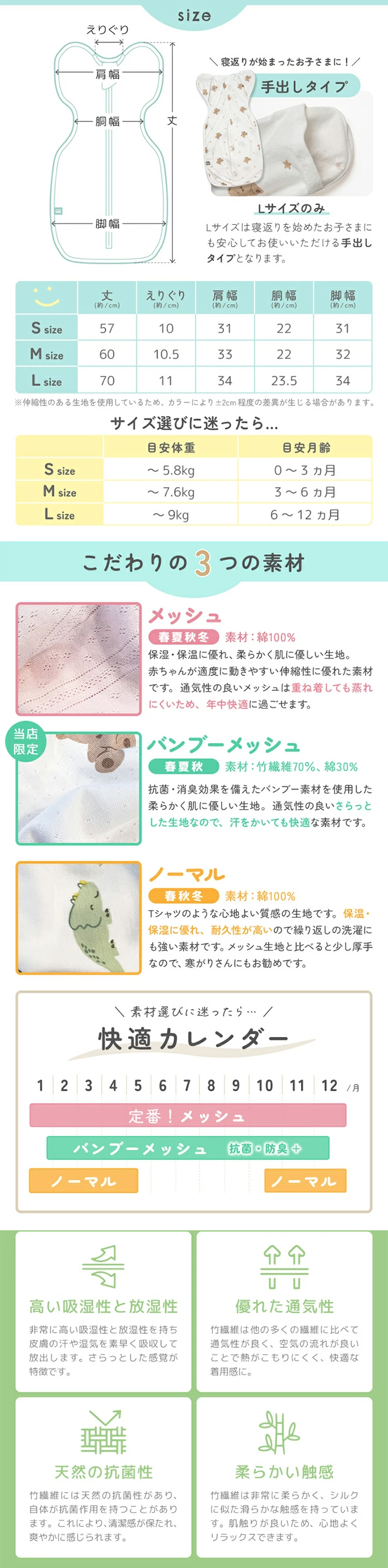 | 目安体重・月齢 | 【S】体重;〜5.83kg 月齢:0〜3カ月 【M】体重;〜7.67kg 月齢:3〜6カ月 【L】体重;〜9.09kg 月齢:6〜12カ月 |