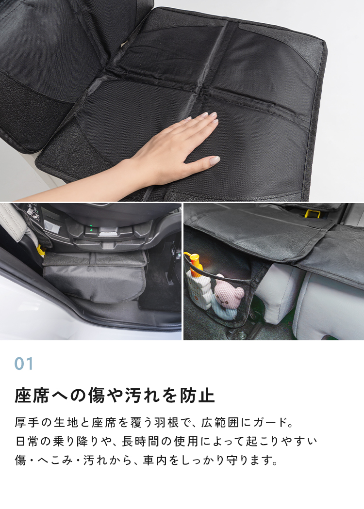 | チャイルドシート使用時に気になる、車のシートの傷・へこみ・汚れを防ぐための保護マットです。厚手の生地が座面へのダメージを軽減します。 撥水加工でお手入れ簡単。通気性が高く、湿気がこもりづらい構造です。滑り止め加工でずれにくく、収納ポケット付きで車内の整理整頓にも便利。 ISOFIX方式に対応しており、様々な車種・チャイルトシートに対応しています。 |