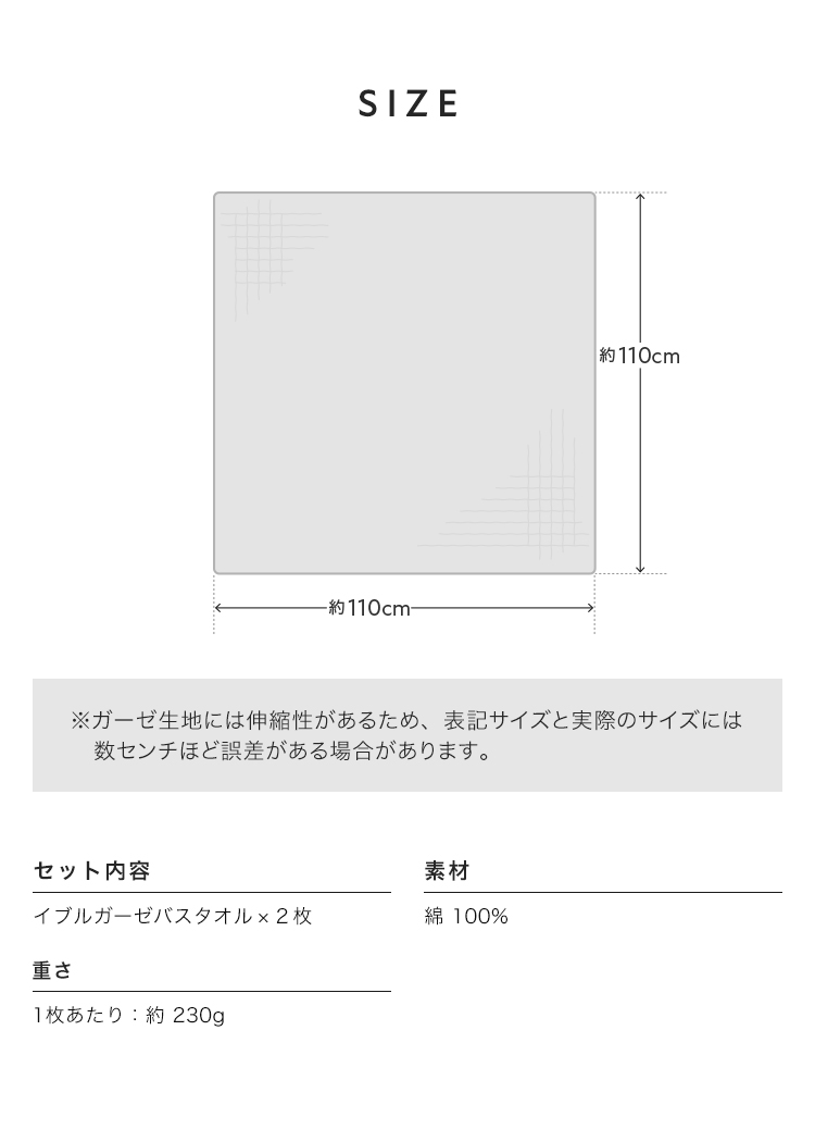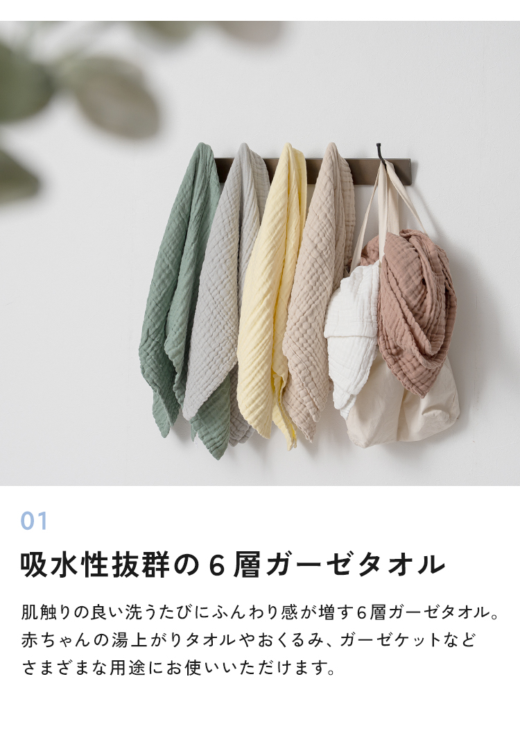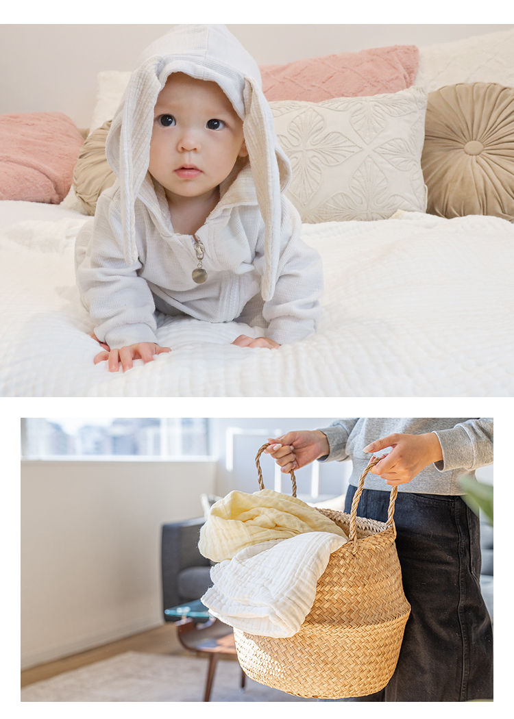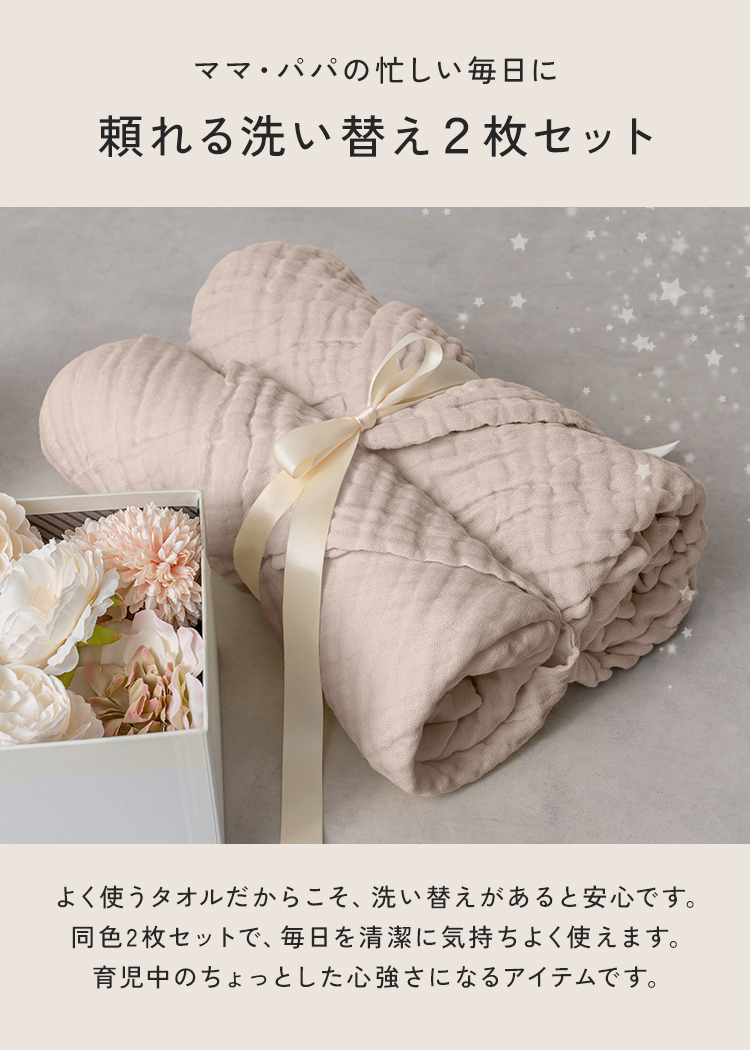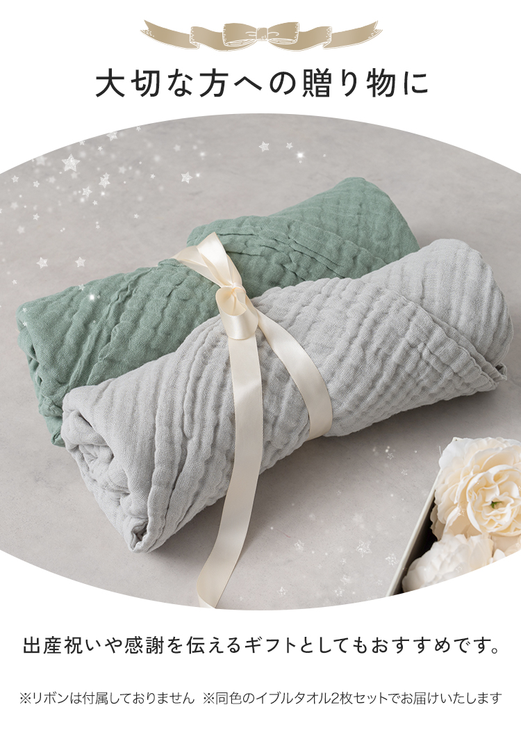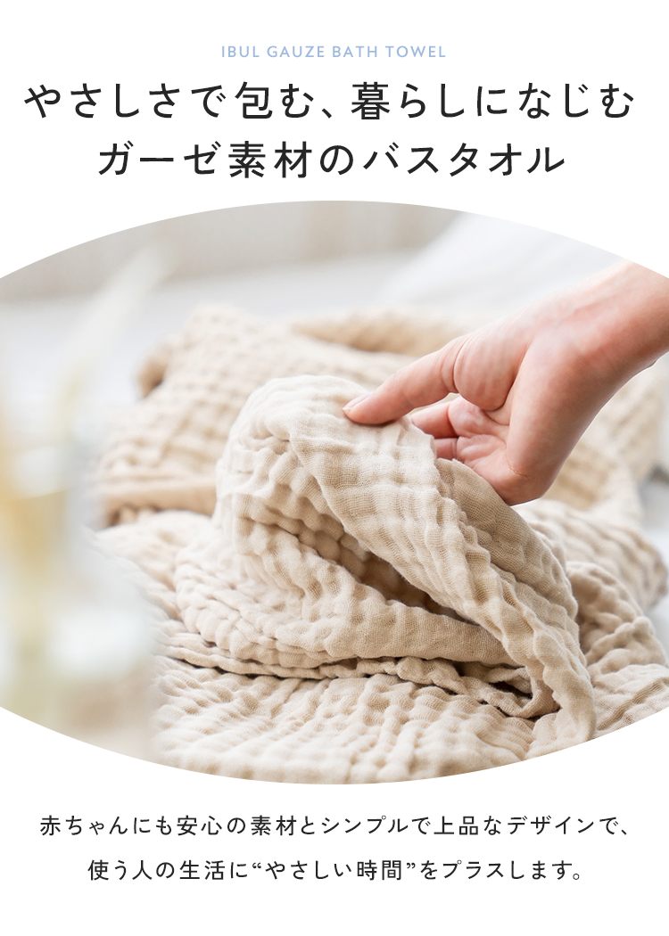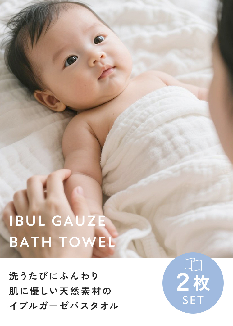 | 肌にやさしい天然素材を使った「ibulガーゼバスタオルセット2枚セット」。 韓国発のイブルを使用したした6層ガーゼならではの高い通気性と吸水性で、洗うほどにふんわり。 厚みがあり保温力もあるため、赤ちゃんや敏感肌の方にも安心です。シンプルで上品なデザインの同色2枚セットは、ギフトにもよく映えます。 |