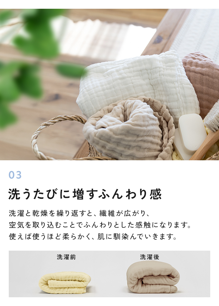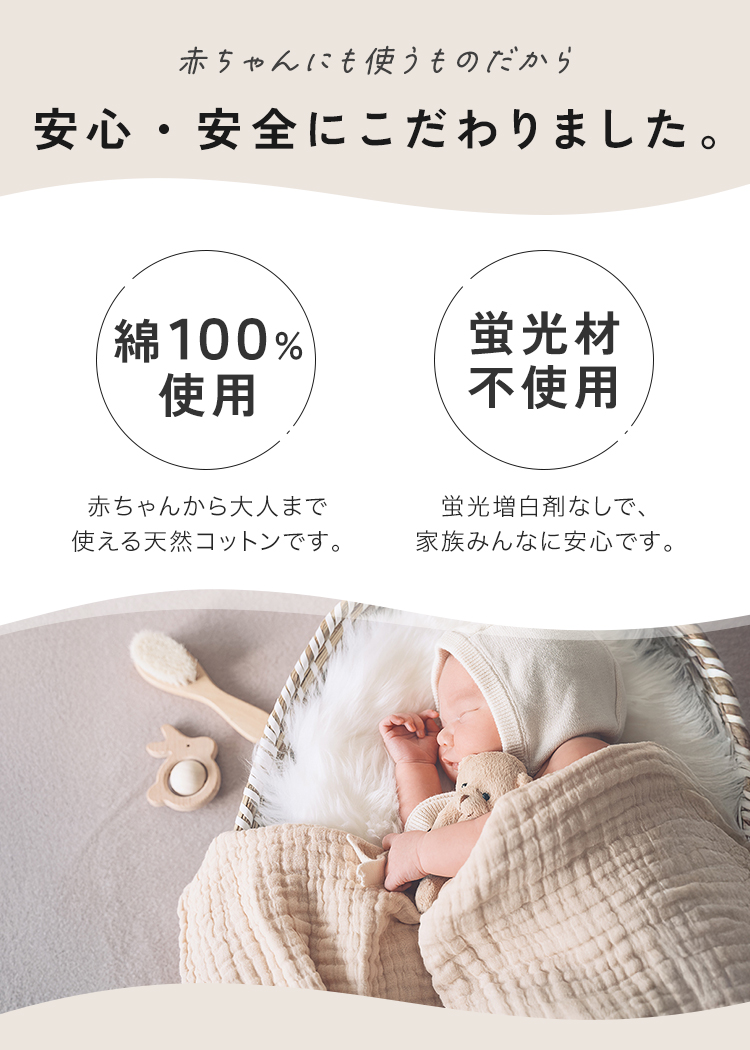 | ■天然繊維100%の特性上、どうしても毛羽落ちが生じやすい素材となっております。 初回は洗濯ネットを使用せず、たっぷりの水量で単独洗いをしていただくことで毛羽が落ちやすくなります。 気になる場合は、数回のお洗濯を重ねていただくと、徐々に落ち着きますのでお試しください。 なお、毛羽落ちが落ち着くまでは、柔軟剤のご使用はお控えいただくことをおすすめいたします。 ・本来の用途以外には使用しないでください。 ・高温・多湿、直射日光の当たる場所での保管はお避けください。カビや変形、変色などの原因となります。 ・火気の近くや高温の場所で使用・保管しないでください。 ・製品仕様やパッケージは改良のため予告なく変更される場合があります。 ・素材の特性上、サイズや色味は生産時期やロットにより若干の差異が生じることがあります。 ・商品の色は、画面上の画像と実物とでは多少異なる場合があります。あらかじめご了承ください。 ・お洗濯の際は洗濯ネットをご使用ください。 ・素材の特性上、水洗いにより縮みが出ます。洗濯後は、生地を軽く伸ばして形を整えてから吊り干ししてください。 ・乾燥機の使用やドラム式の洗濯〜乾燥は大きな縮みの原因となるためお避けください。 |